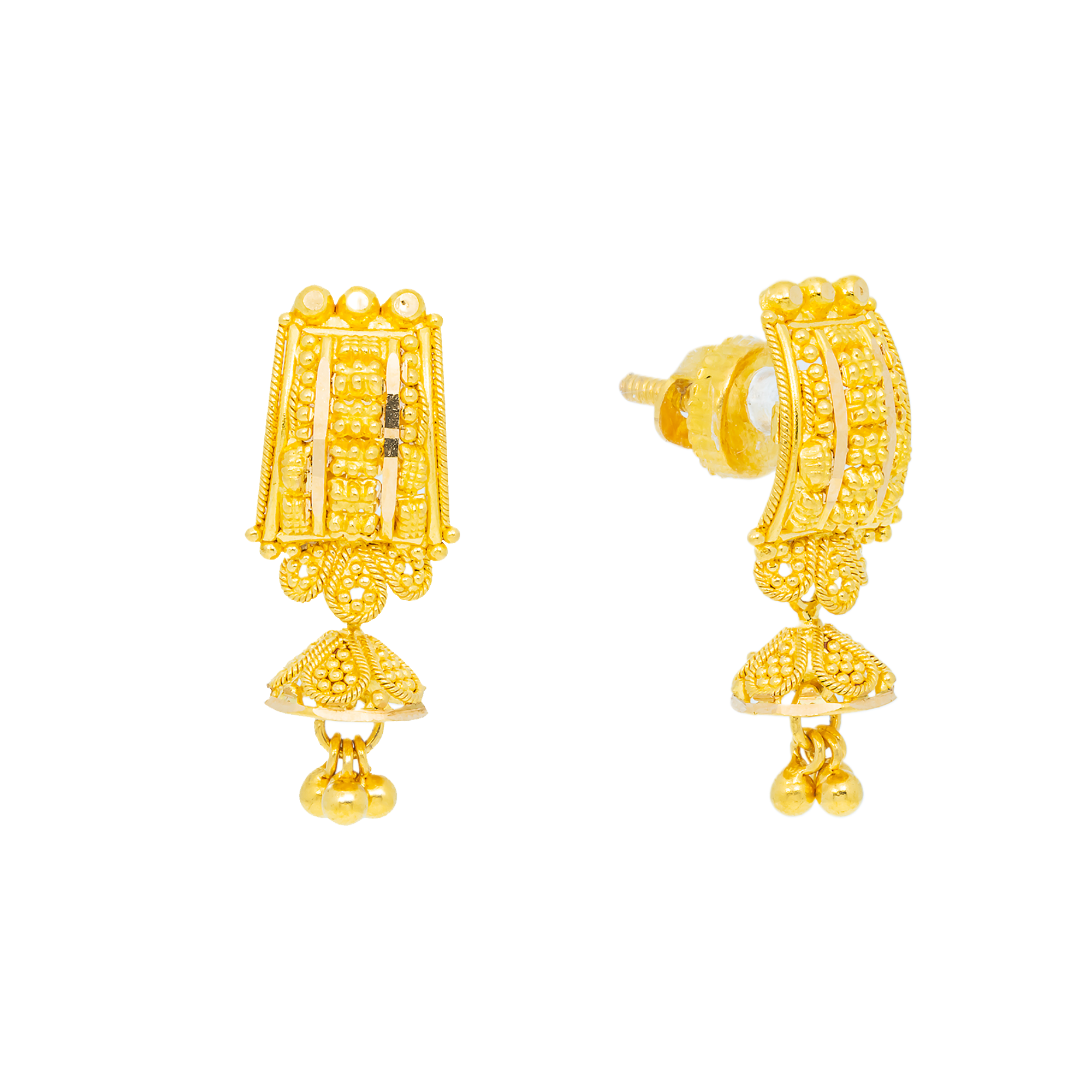 | These 22K gold filigree earrings feature delicate openwork patterns inspired by classic Indian earring design. Their graceful silhouette and luminous finish offer timeless versatility, making them perfect for celebrations or everyday refinement. A beautiful addition to any collection of Indian gold earrings crafted with fine 22k gold jewelry standards. Features • 22K yellow gold • Filigree details Specifications • Minimum Width - 1.5 millimeters • Maximum Width - 8 millimeters • Length - 0.7 inch • Weight - 4.5 grams |