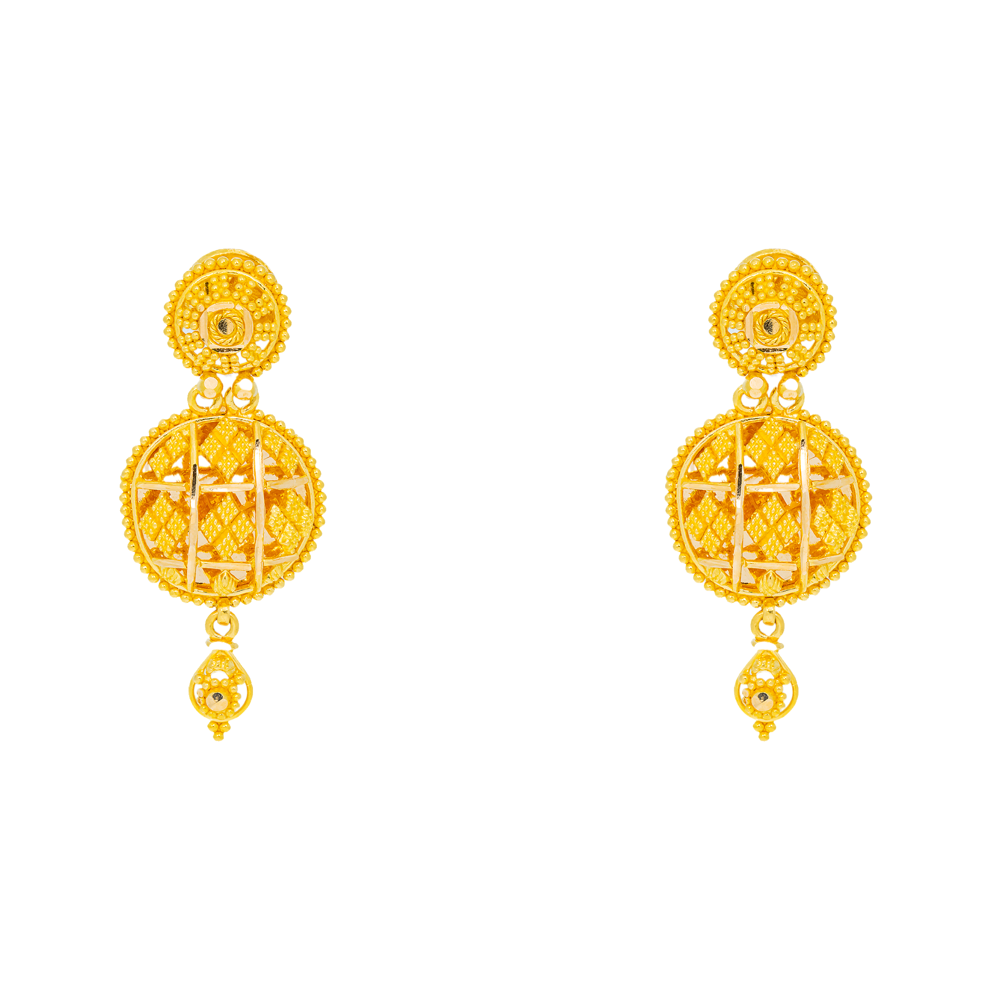 | Intricate filigree detailing shapes these 22K gold drop/dangle earrings into a graceful, light-catching silhouette. Inspired by Indian craftsmanship, their openwork texture adds quiet luxury to any ensemble. A sophisticated choice for collectors seeking elevated Indian gold earrings crafted from fine 22k gold jewelry. Features • 22K yellow gold • Filigree details Specifications • Minimum Width - 2 millimeters • Maximum Width - 14.5 millimeters • Length - 1.2 inches • Weight - 7 grams |