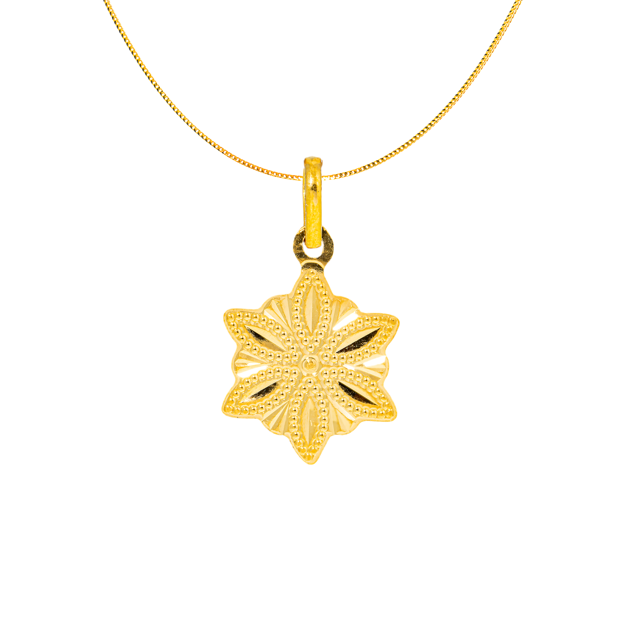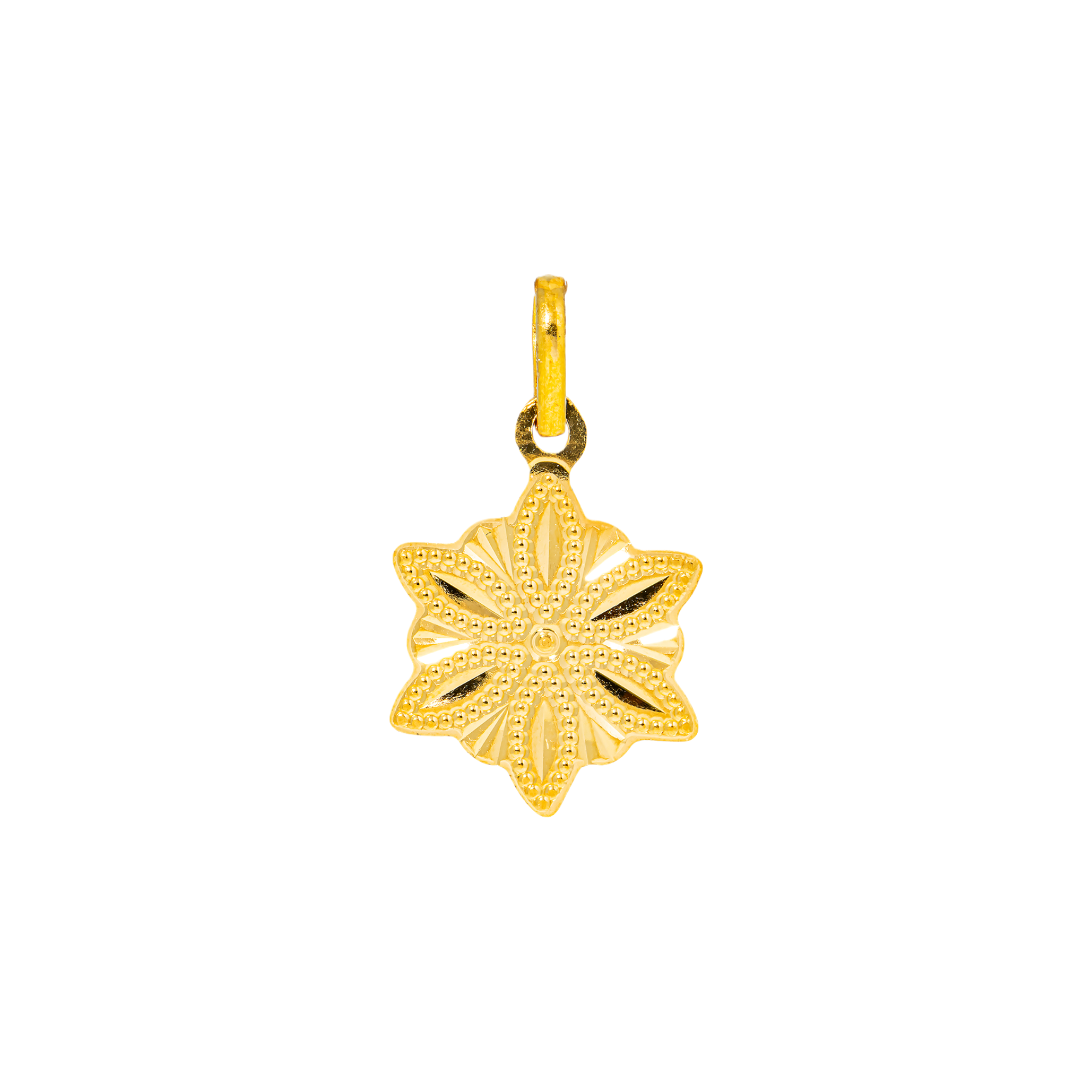 This dainty and delicate 22k yellow gold pendant enriched with engraved texture creates a sophisticated floral design ideal for layering or wearing solo as a signature piece.