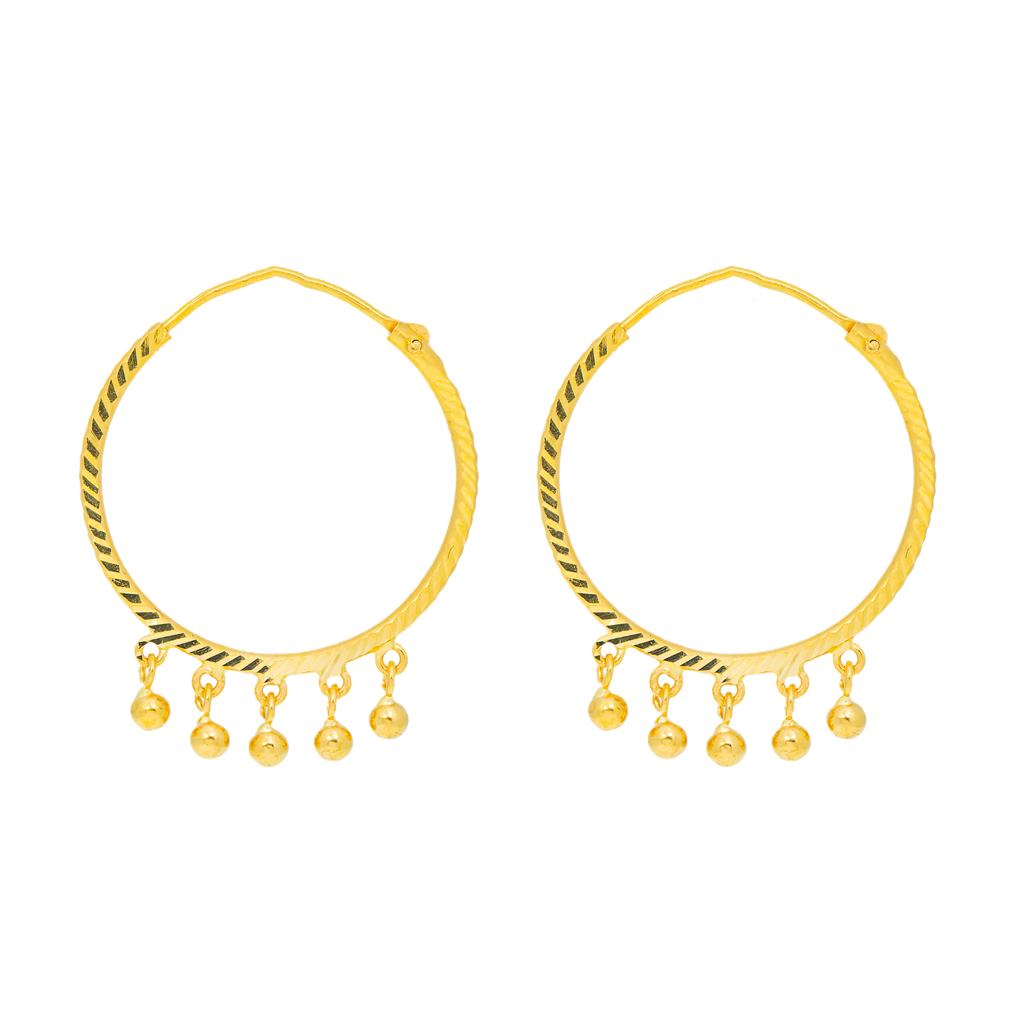 | These 22K yellow gold earrings radiate soft, golden brilliance, perfect for elevating any ensemble. Their timeless structure ensures long-lasting appeal, making this pair of gold hoops a beautiful investment for admirers of Indian gold earrings. Features • 22K yellow gold Specifications • Minimum Width - 1 millimeter • Maximum Width - 25 millimeters • Length - 1 inch • Weight - 2.9 grams |