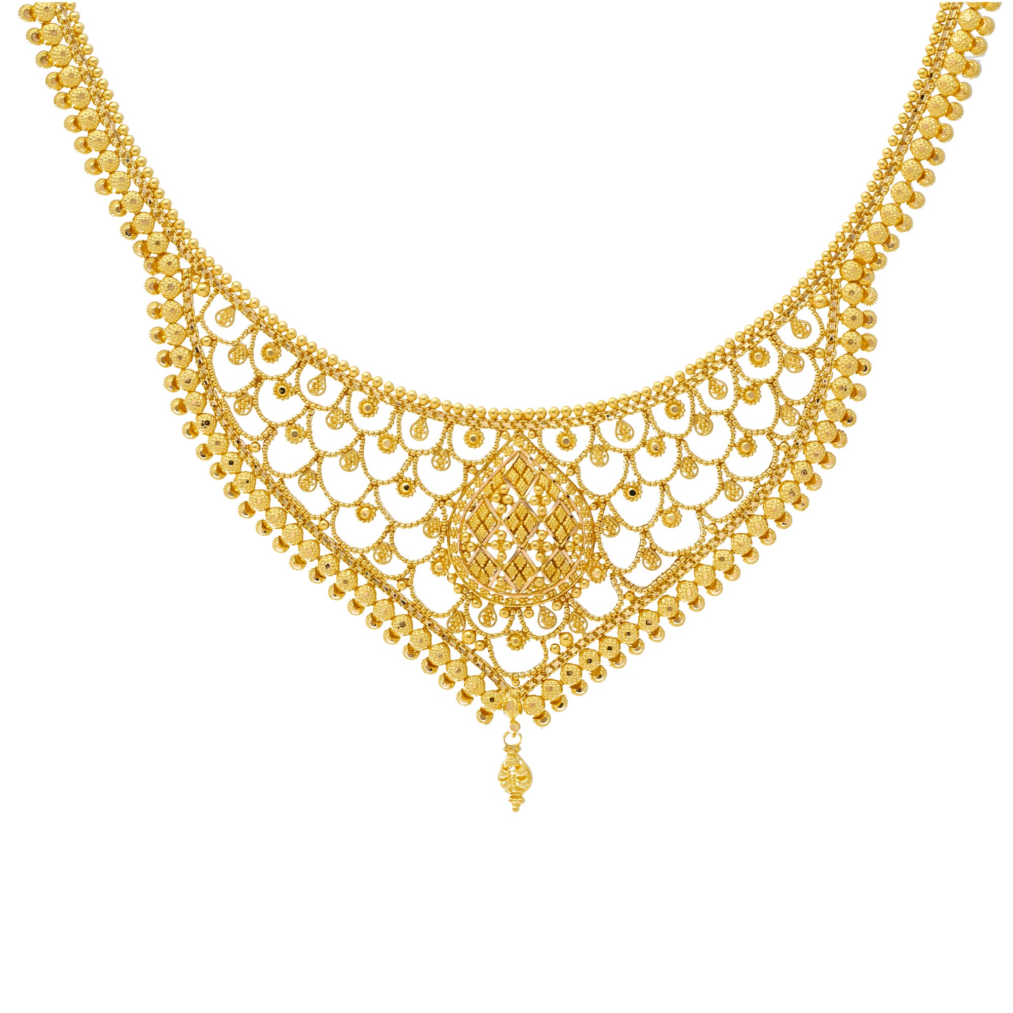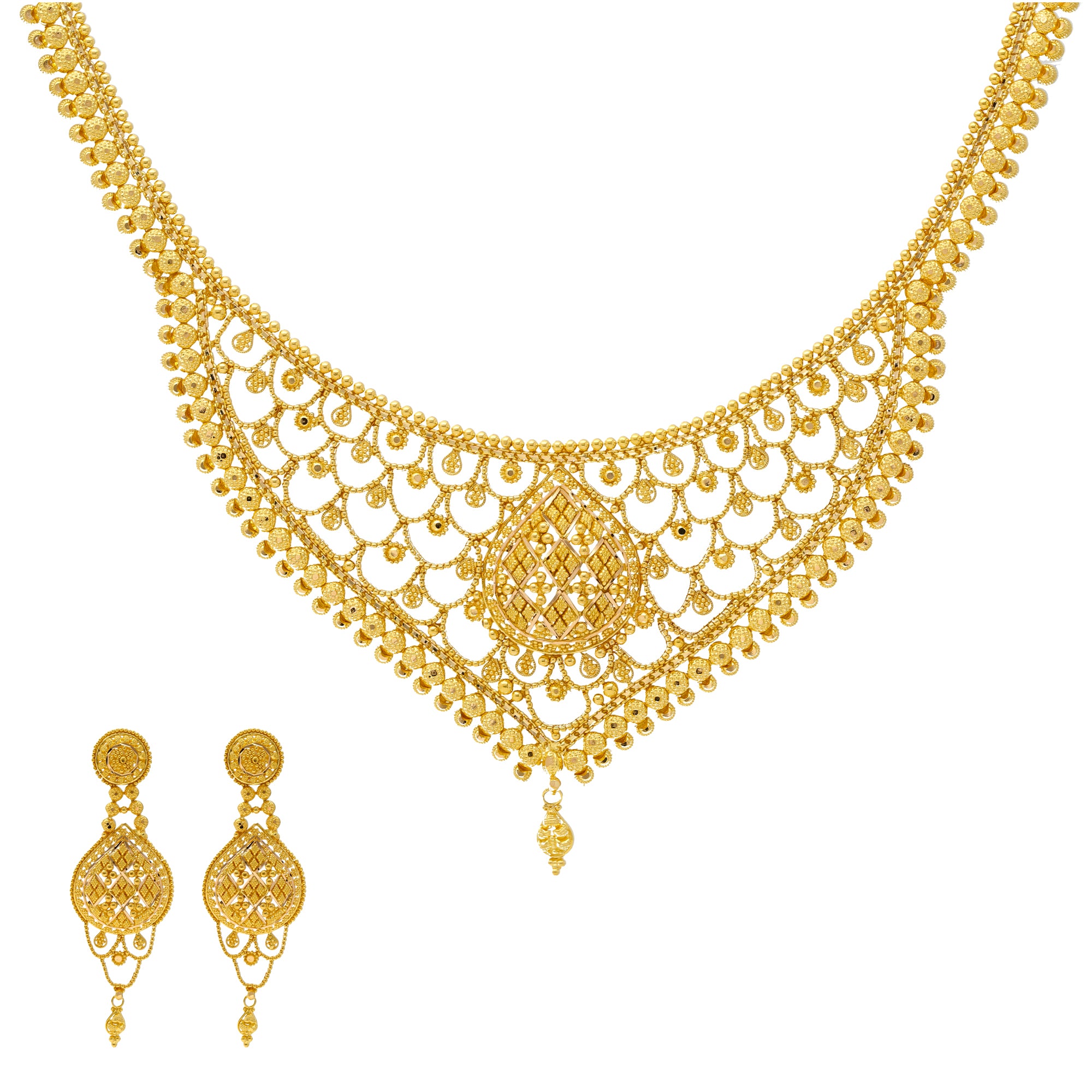 The 22K Yellow Gold Jiera Necklace Set is demure, classy, and chic. This ultra femanine 22k gold necklace and earring set for women has a traditional Indian design and style that can elevate both your cultural or casual attire.