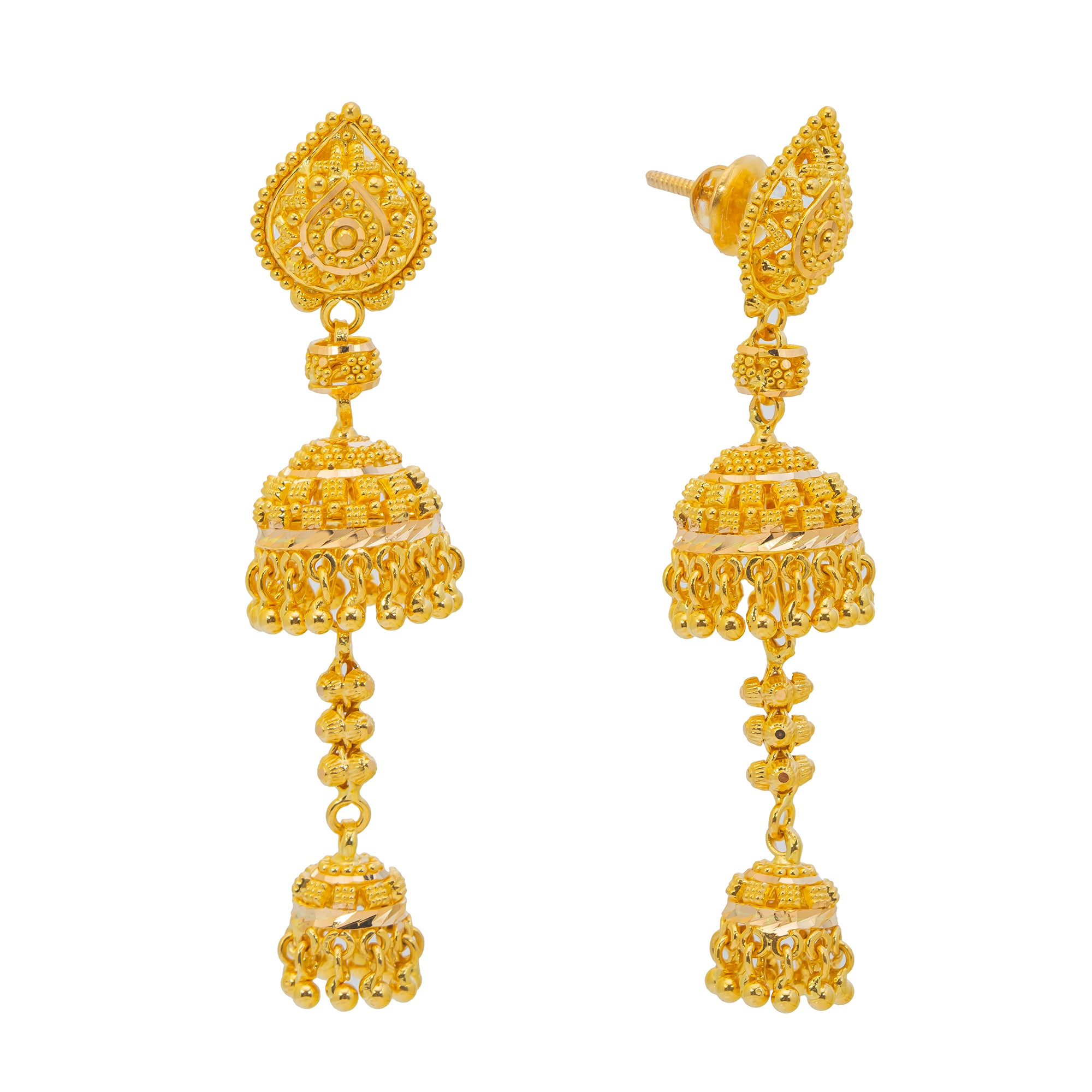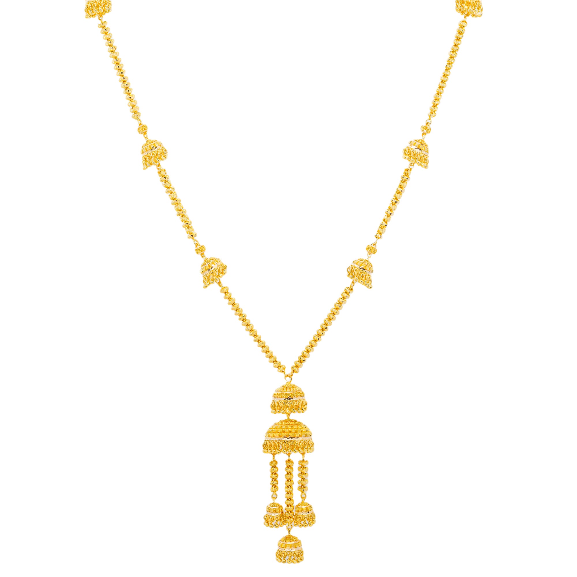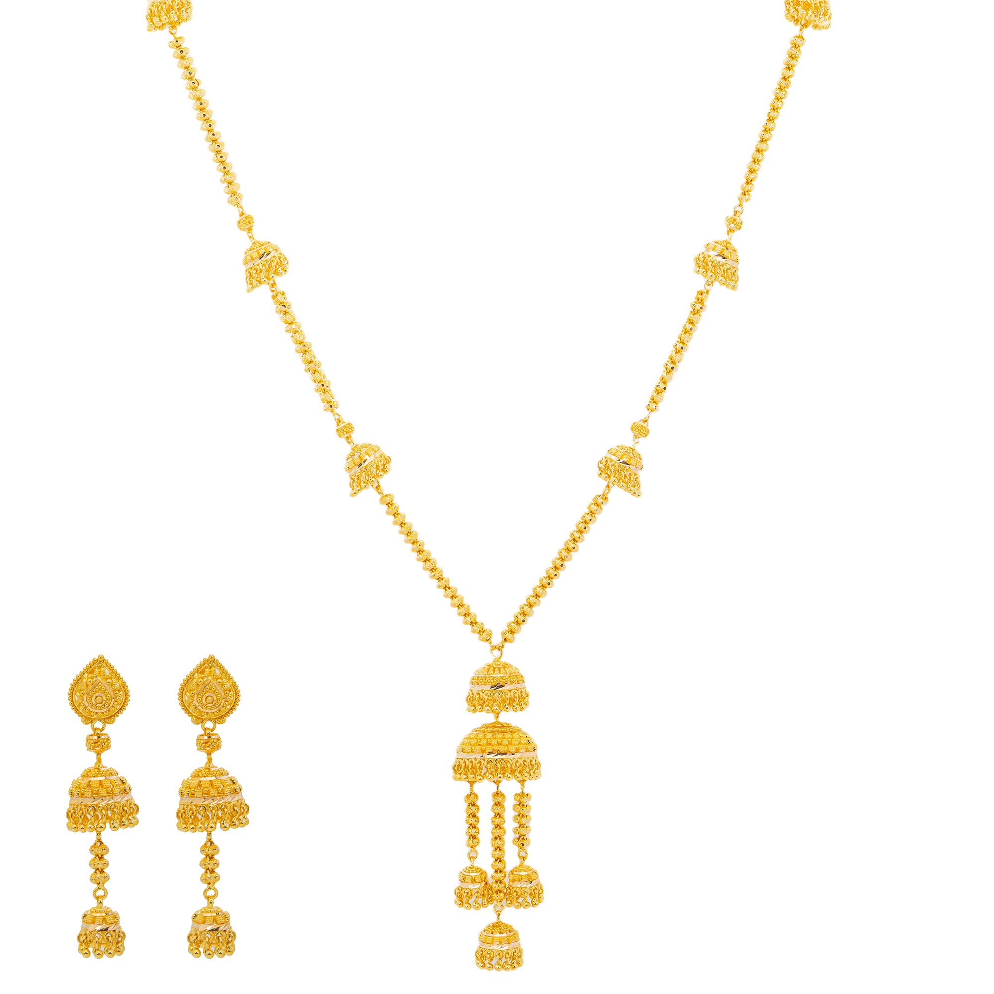 This 22k gold jhumki earring and necklace set  uses beaded details to add an elegant and ladylike appeal to the simple design.