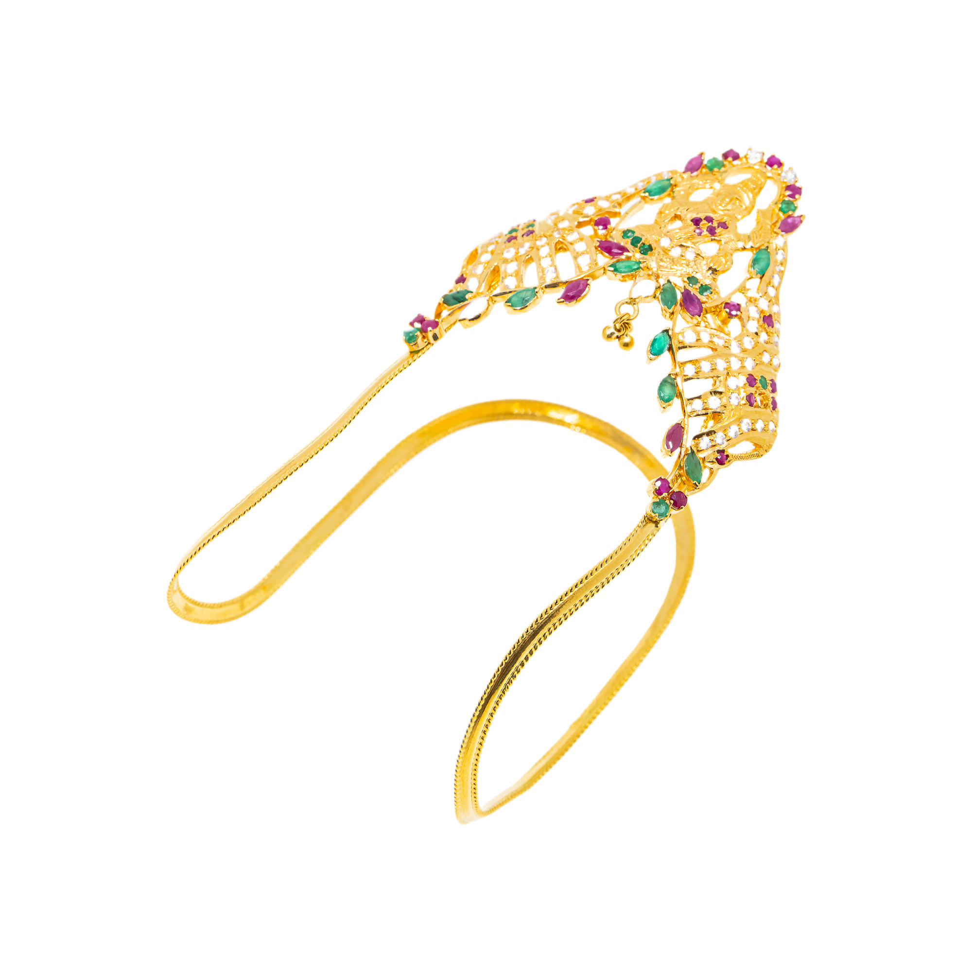 The sparkling display of emeralds, rubies, and cubic zirconia accentuate the Goddess Lakshmi motif engraved in the 22k gold design. This one-of-a-kind piece of Indian gold jewelry is ideal festive occasions, making it a must-have piece of 22k gold jewelry for cultural celebrations.