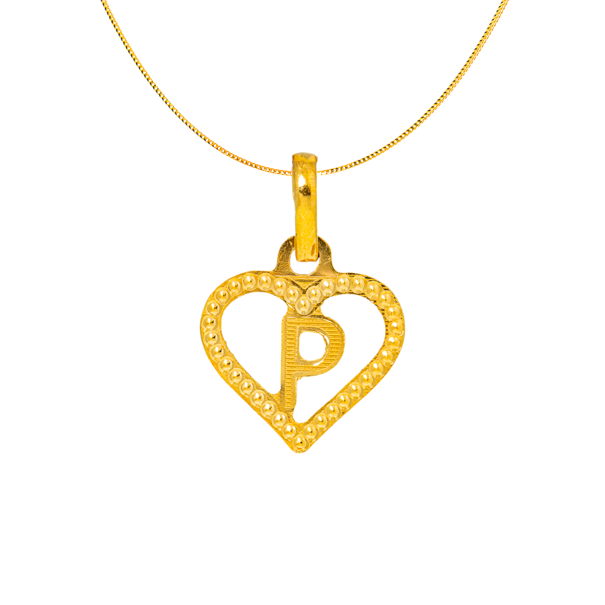 Elegant and timeless, this 22K gold pendant features a letter P centered inside of a polished heart-shaped frame that catches the light beautifully.