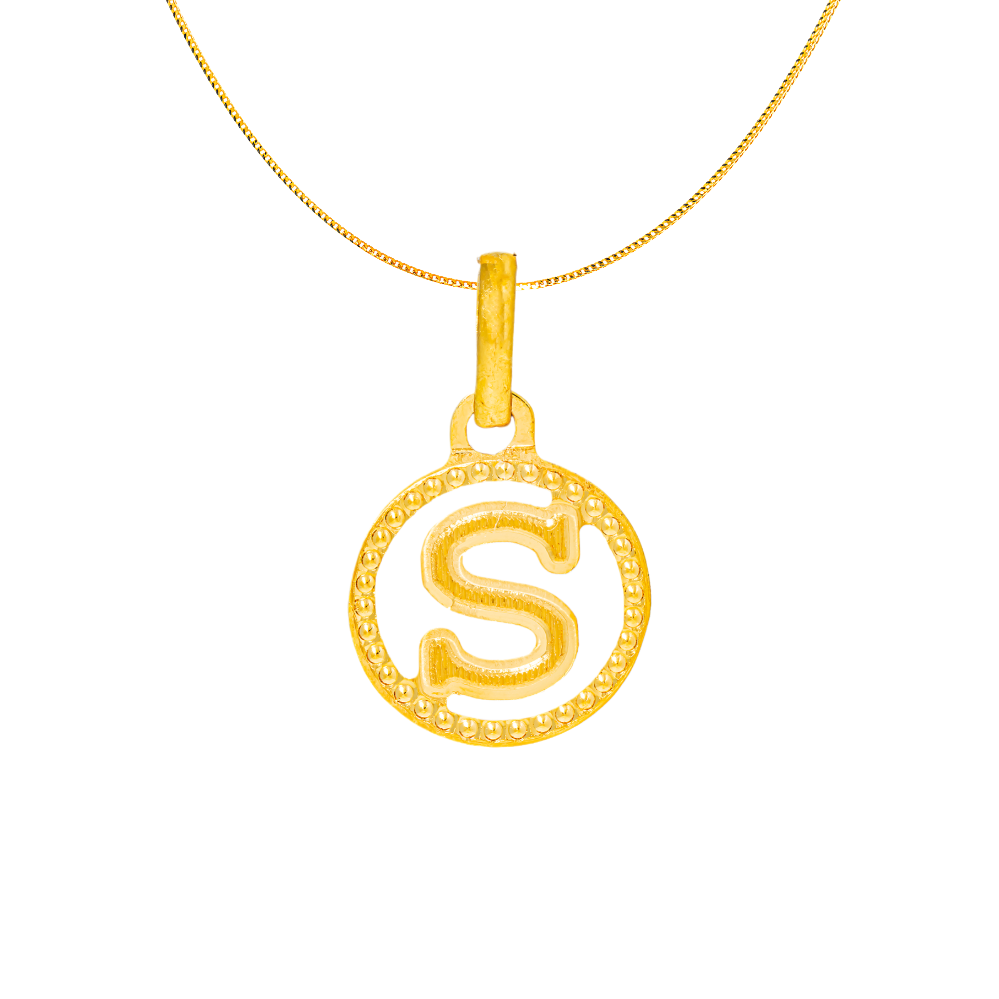 This elegant 22k yellow gold round pendant delivers elegance with its letter "s" initial and warm yellow-gold glow. It's a chic signature piece of gold jewelry for daily occasions.