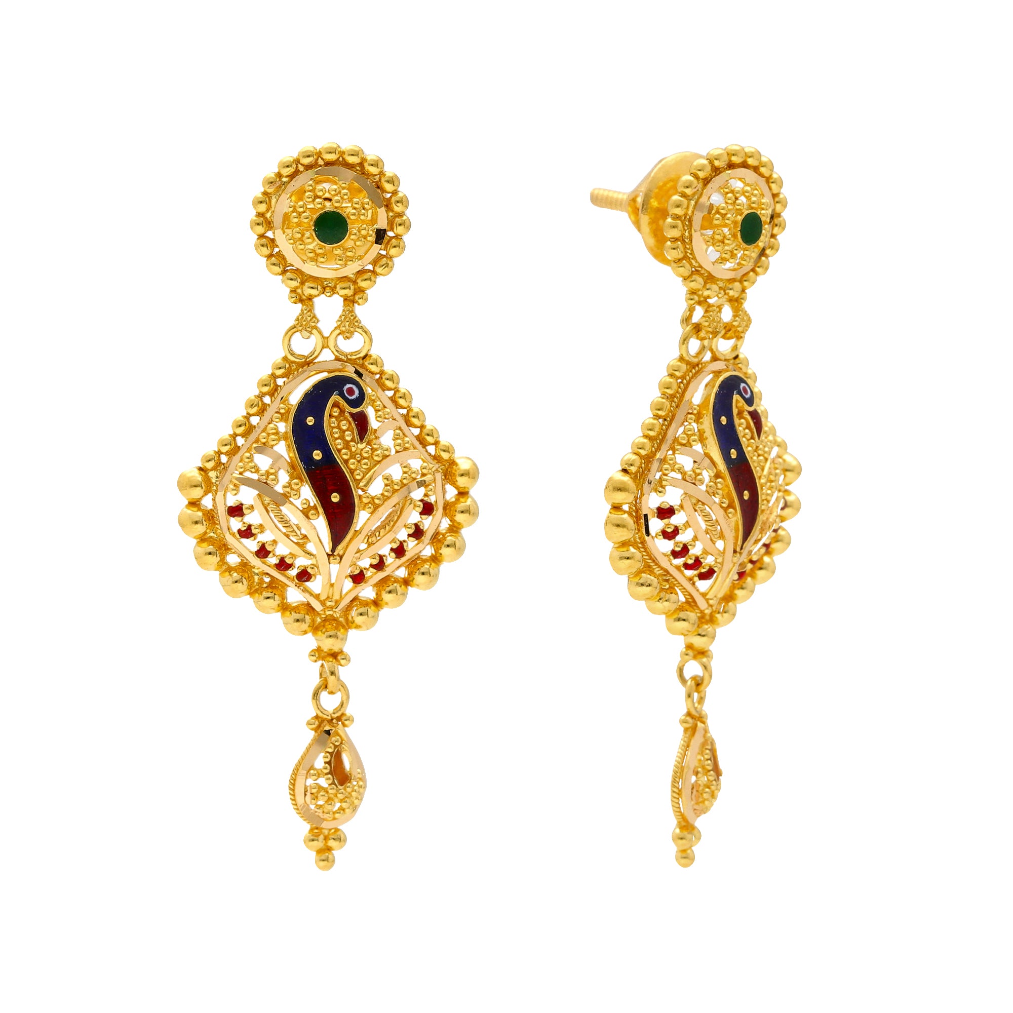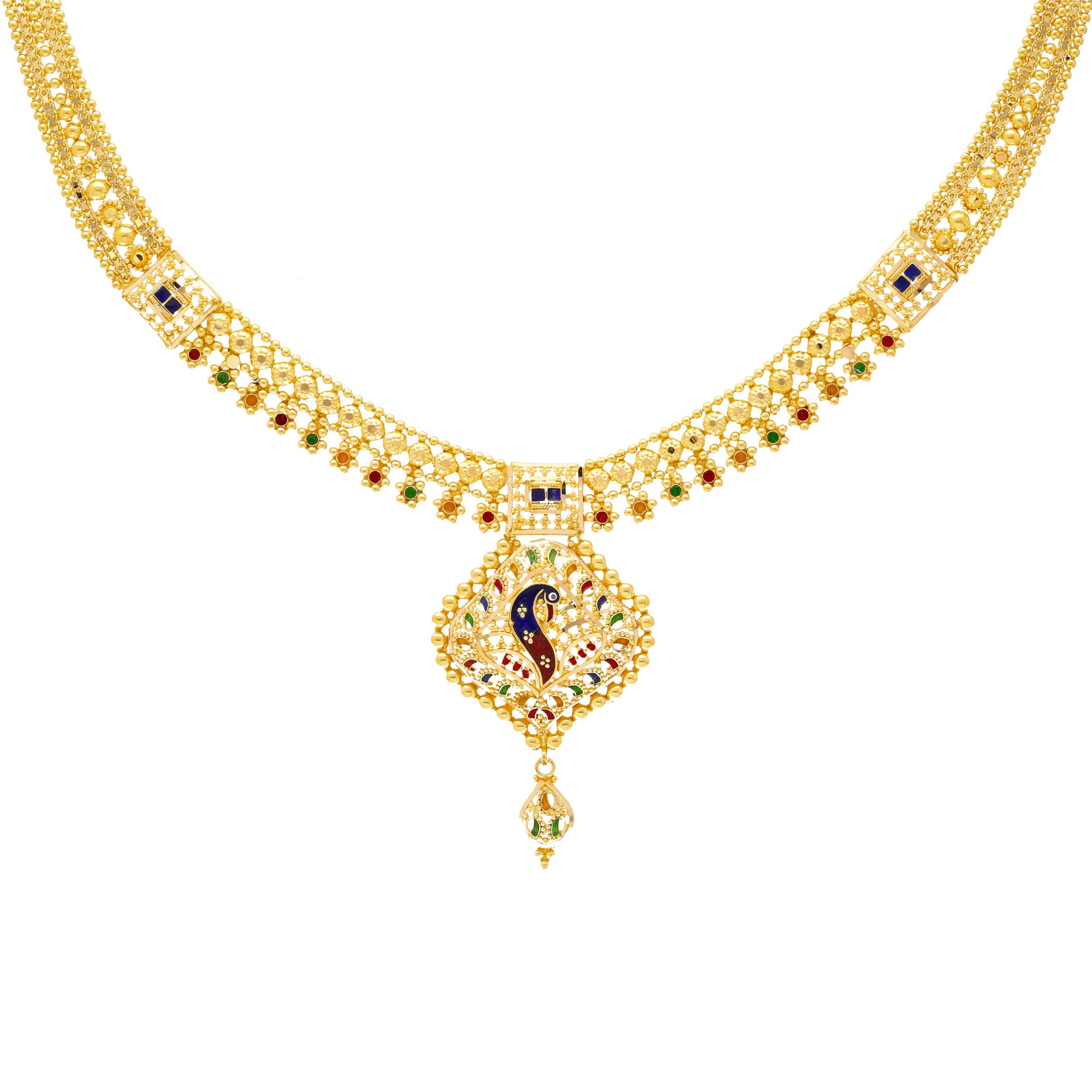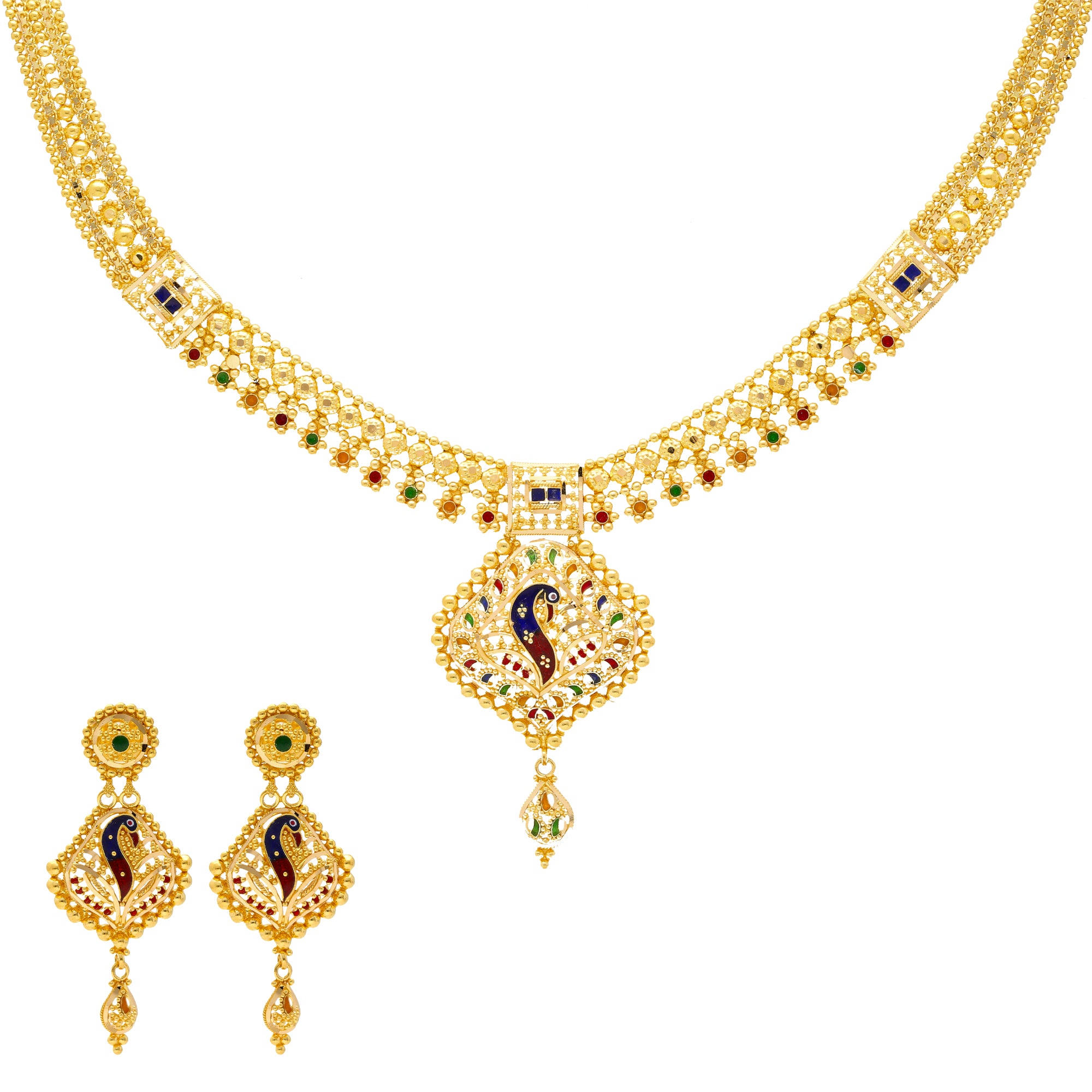This light and airy 22k gold jewelry set for women has a wonderful peacock design crafted out of hand painted meenakari details.