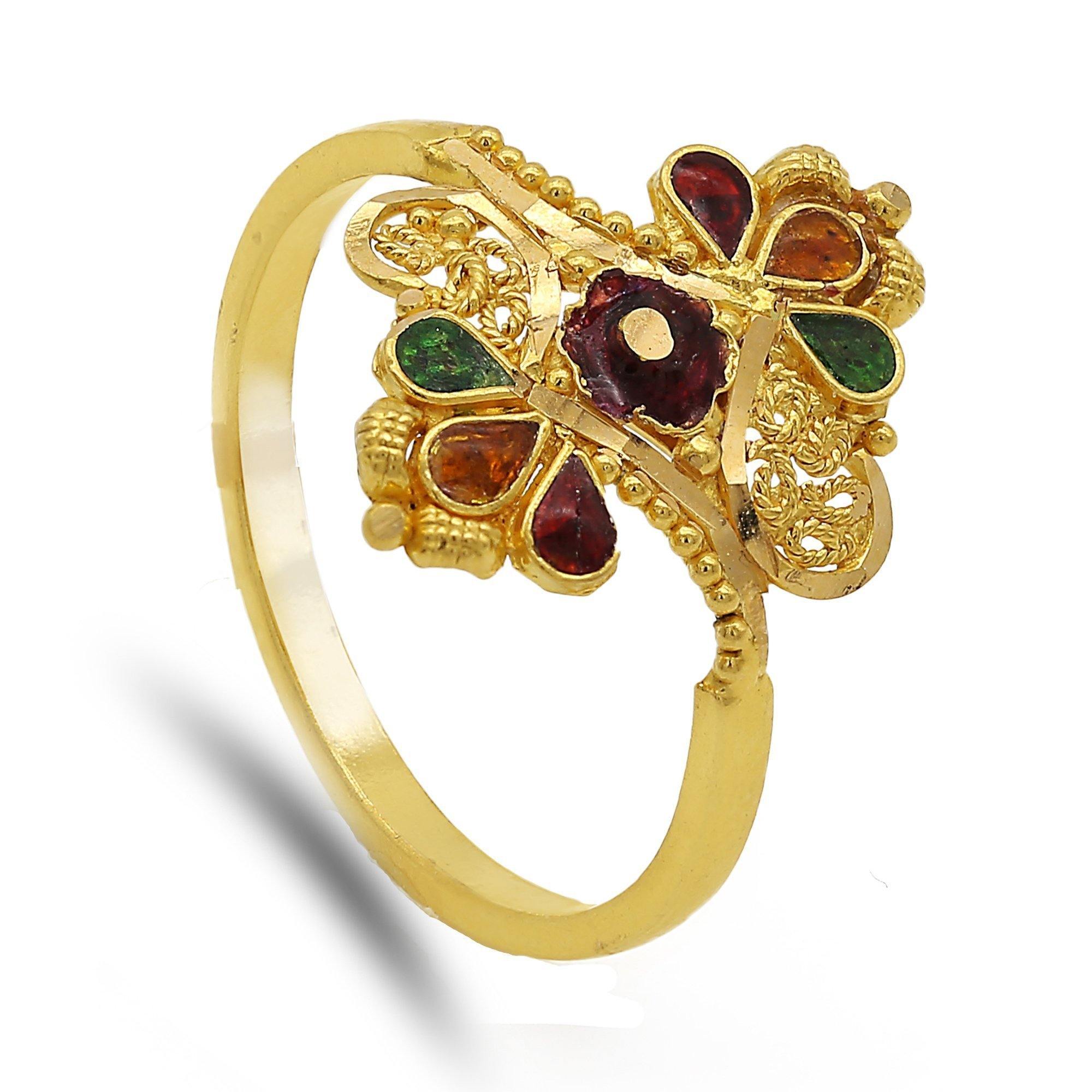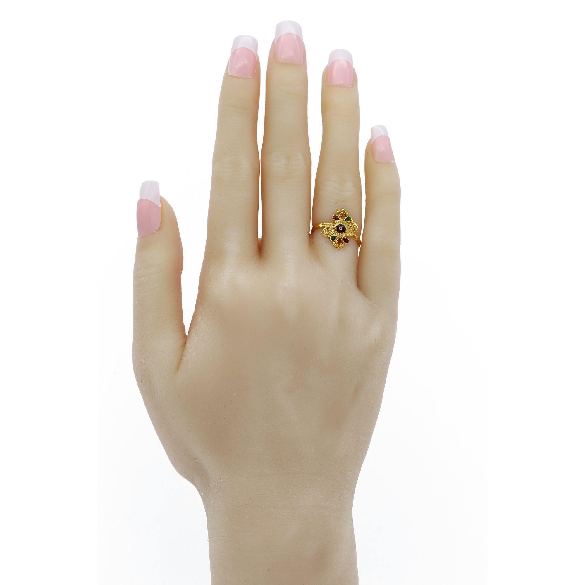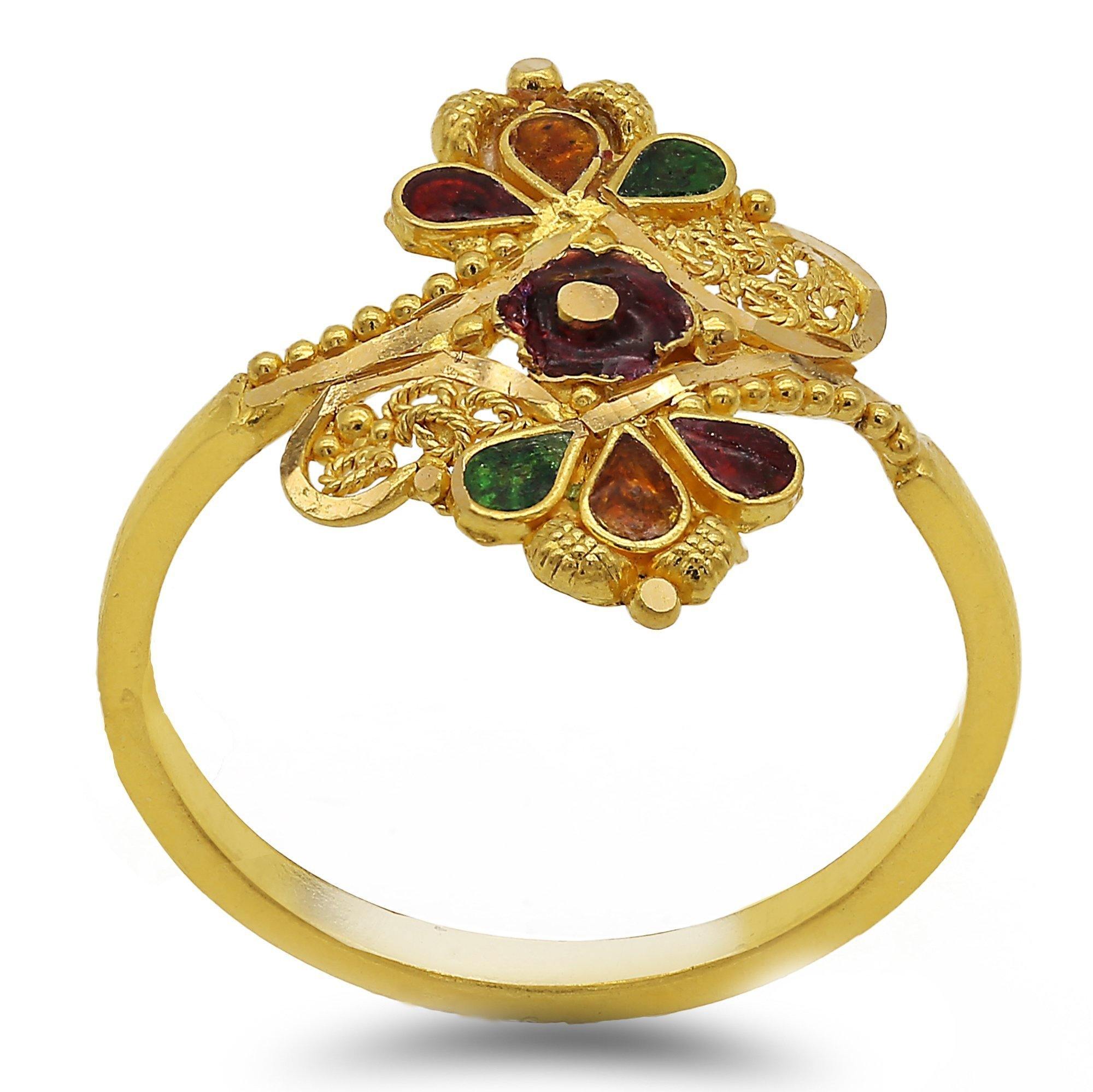 22K Yellow Gold Mirrored Enamle Ring. Ring features hand crafted beaded mirrored design with colorful enamel accents. Total weight is 2.27 grams and finger size is 5. Stunning statement ring.