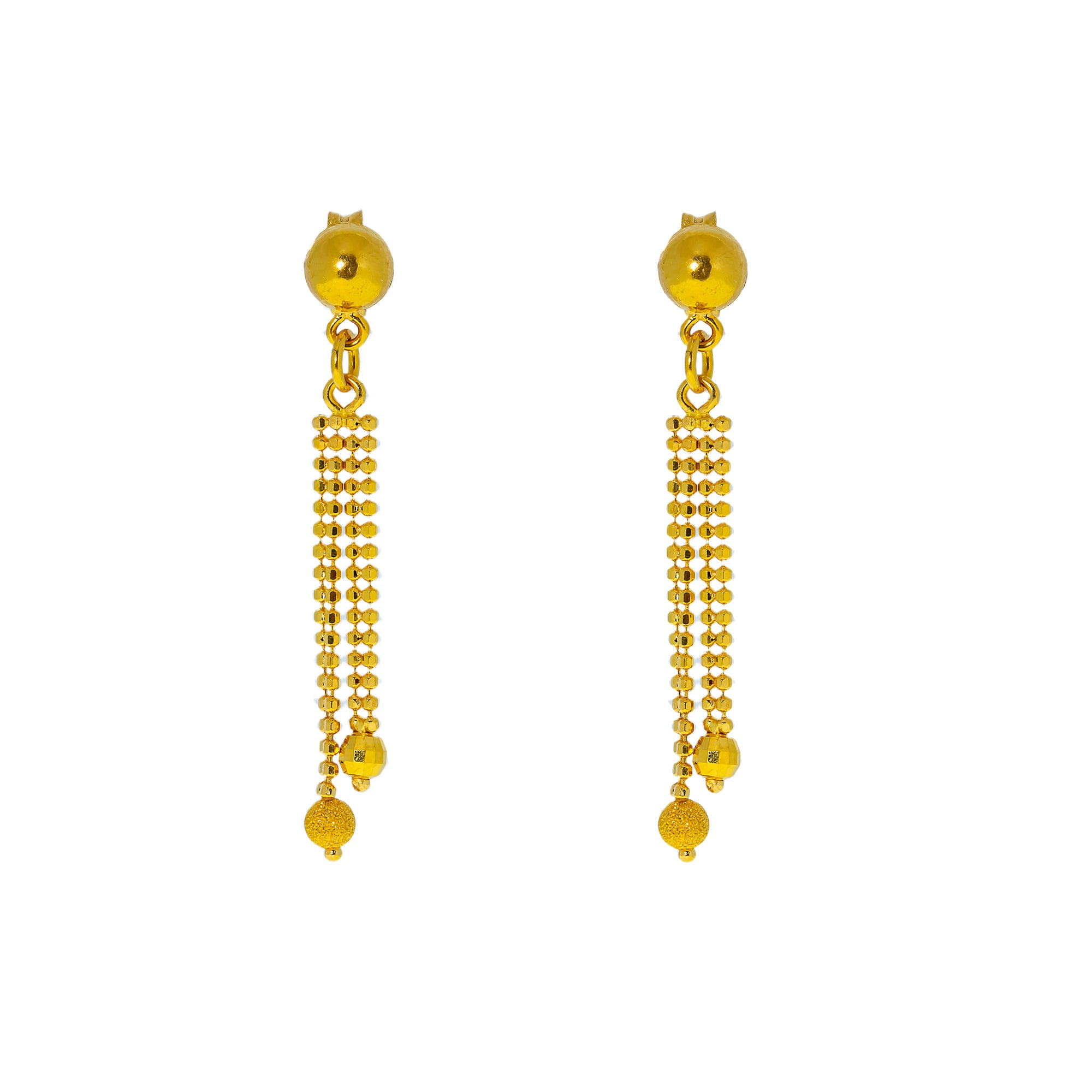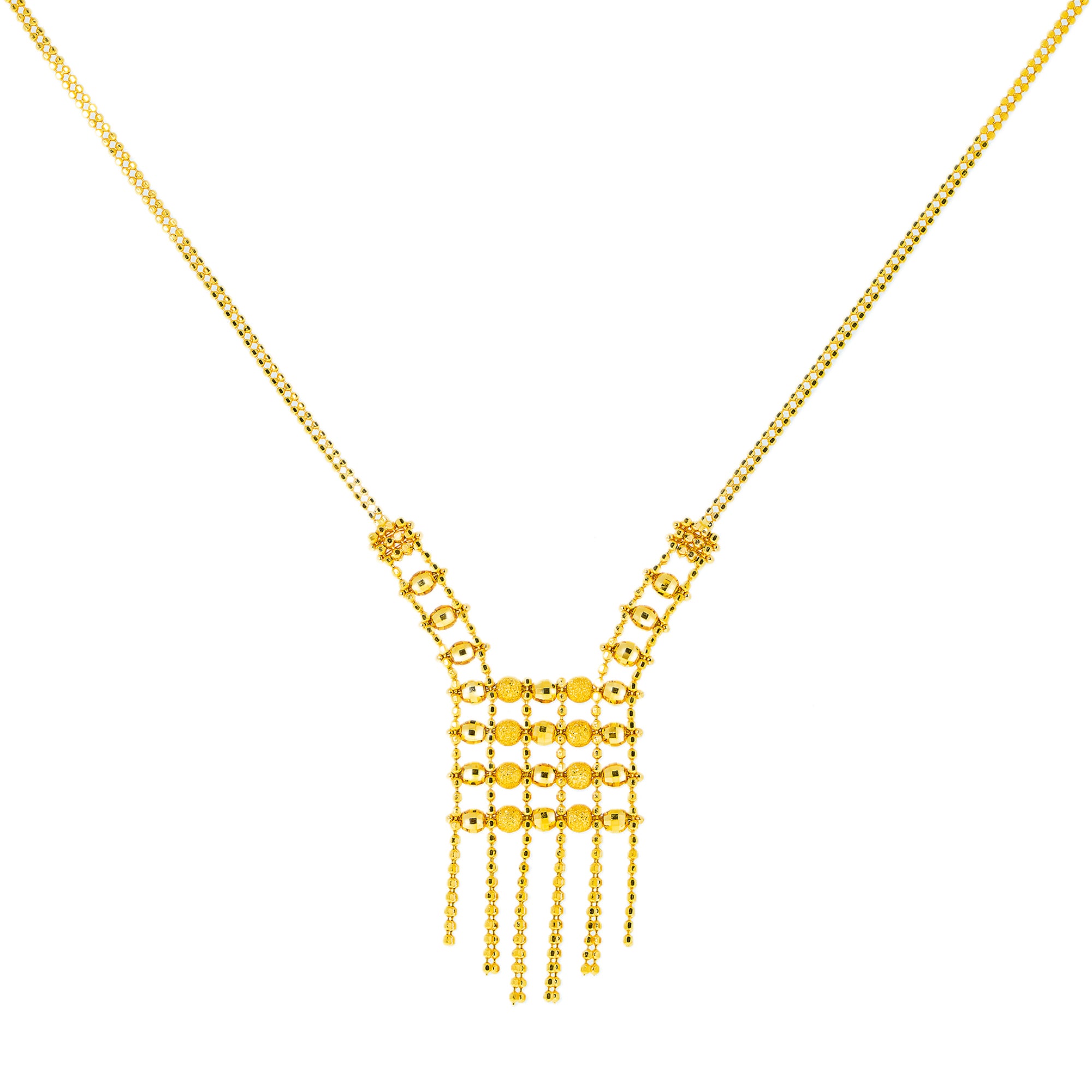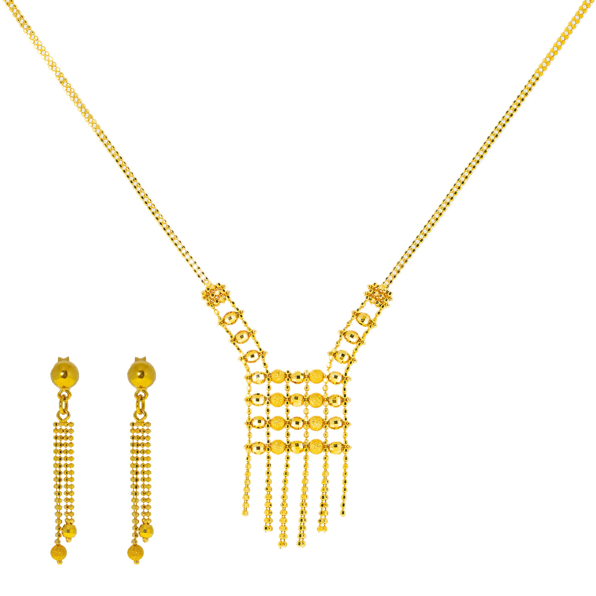 | Designed for timeless sophistication, this 22k gold necklace and earrings set showcase delicate craftsmanship with graceful detailing. Made entirely of yellow gold, this indian jewelry set offers a classic silhouette that complements traditional attire and modern elegance alike. Features • 22K yellow gold Necklace Specifications • Minimum Width - 1 millimeter • Maximum Width - 21 millimeters • Length - 19 inches Earring Specifications • Minimum Width - 1 millimeter • Maximum Width - 5 millimeters • Length - 1.5 inches This necklace and earring set has a combined weight of 13.8 grams. |