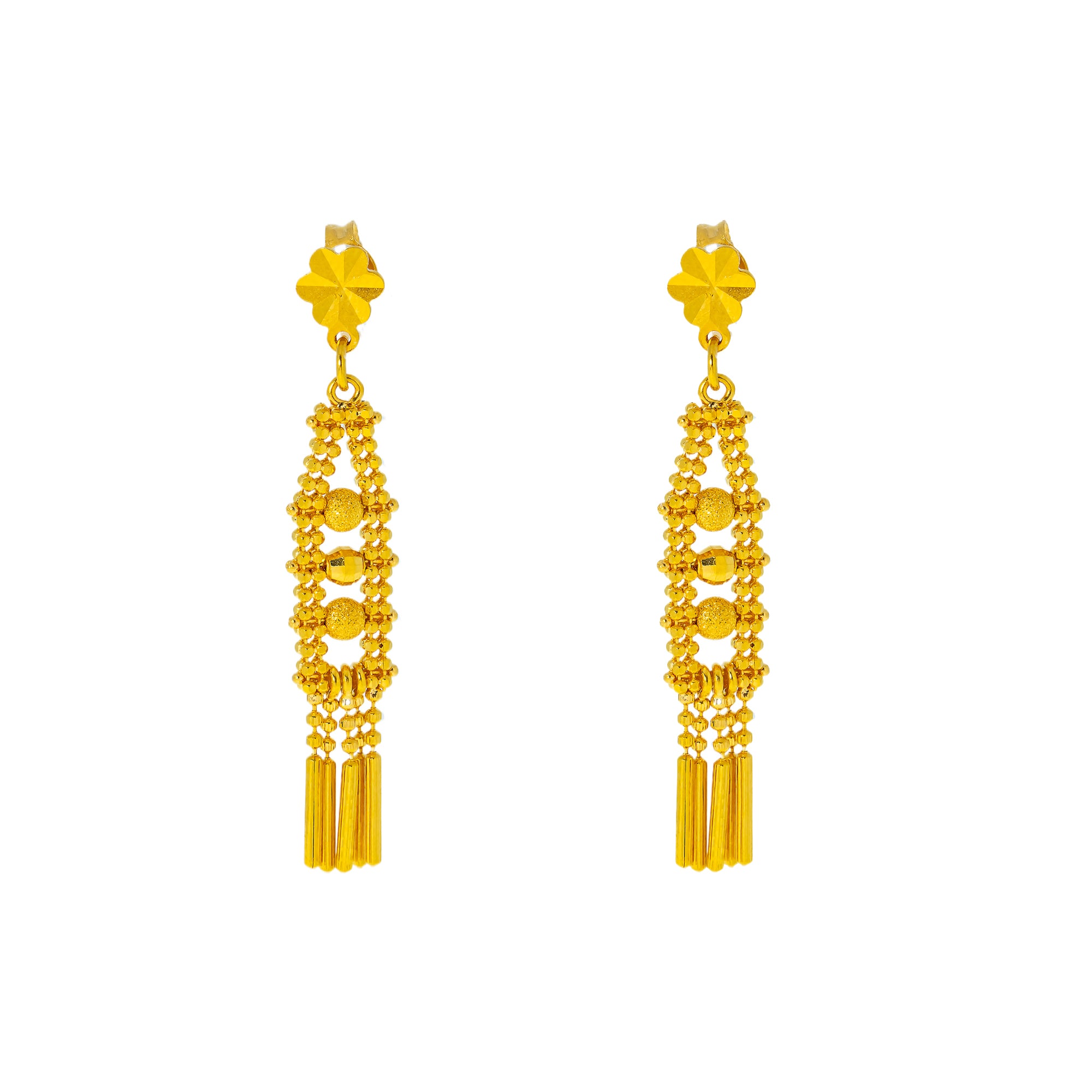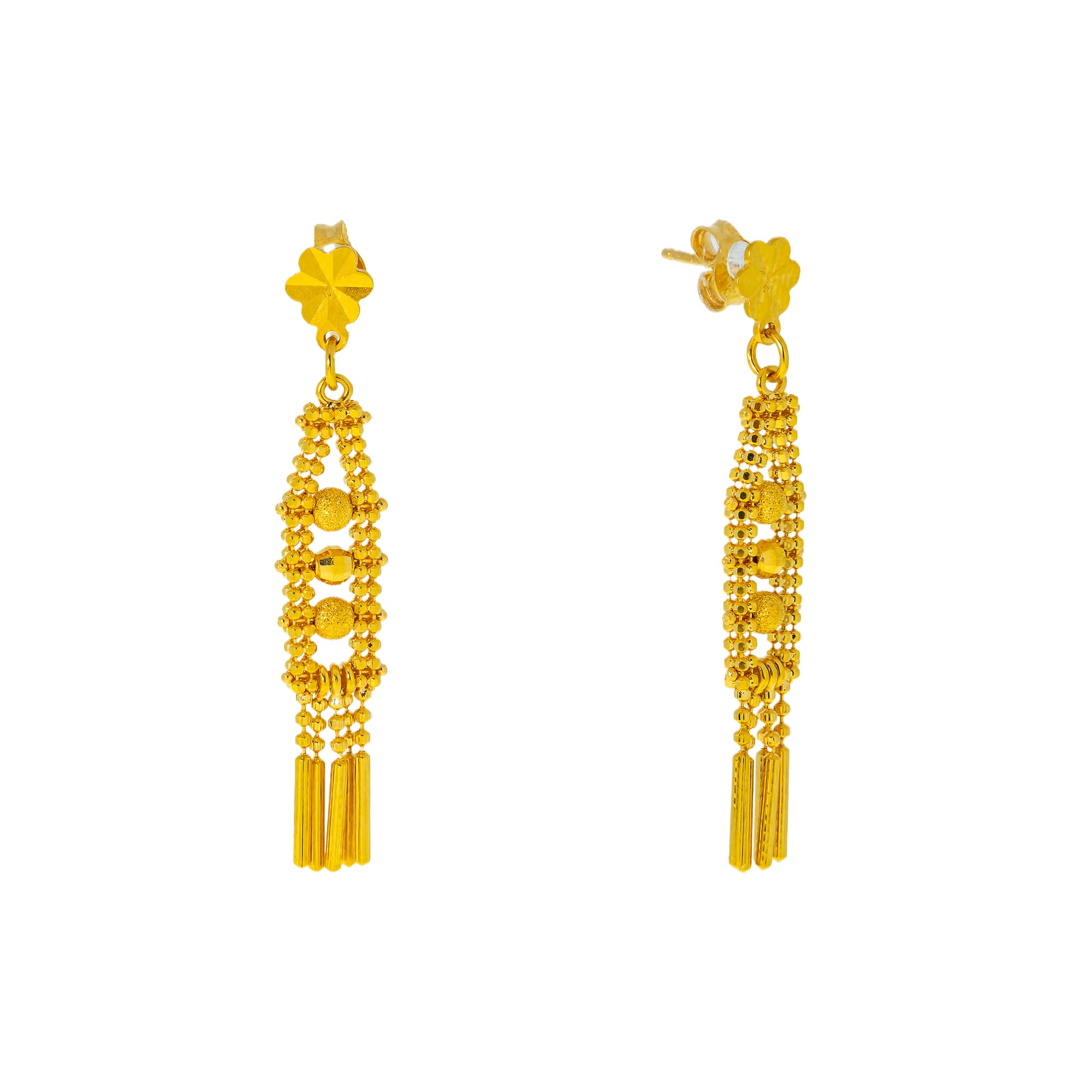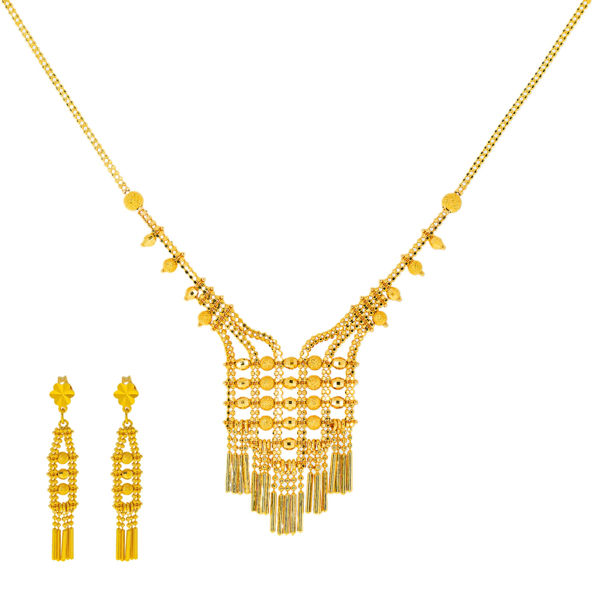| Crafted in glowing 22k pure gold, this necklace and earring set is accented with subtle beading for texture and depth. This gold jewelry set is graceful expression of Indian gold artistry, perfect for special occasions or heirloom gifting. Features • 22K yellow gold Necklace Specifications • Minimum Width - 1.5 millimeters • Maximum Width - 25 millimeters • Length - 18 inches Earring Specifications • Minimum Width - 1 millimeter • Maximum Width - 7 millimeters • Length - 1.5 inches This necklace and earring set has a combined weight of 20 grams. |
