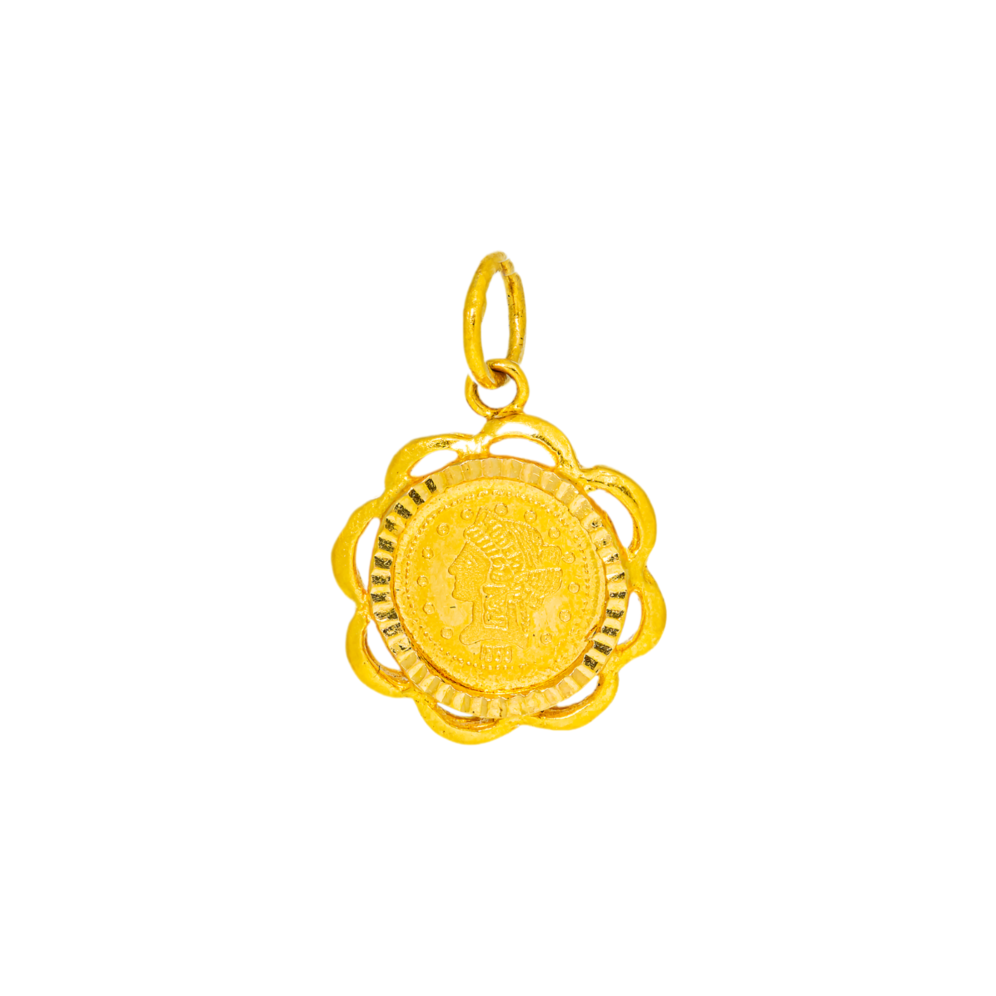 This elegant 22K gold pendant delivers a warm, golden glow and timeless design. Its refined coin-style shape ensures effortless styling across occasions. This gold pendant is a beautiful addition to any 22k gold jewelry collection.