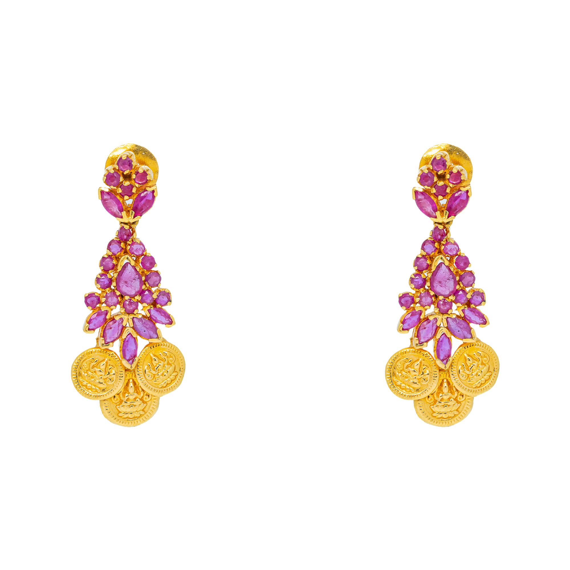 | These 22K yellow gold earrings with rich rubies offers warm, luminous elegance with a timeless silhouette suited for any occasion. Their refined shine elevates both everyday and festive looks, making them a versatile staple for anyone seeking classic Indian gold earrings crafted in premium 22k gold jewelry. Features • 22K yellow gold • Ruby Specifications • Minimum Width - 1.5 millimeters • Maximum Width - 11 millimeters • Length - 1.3 inch • Weight - 9.6 grams |