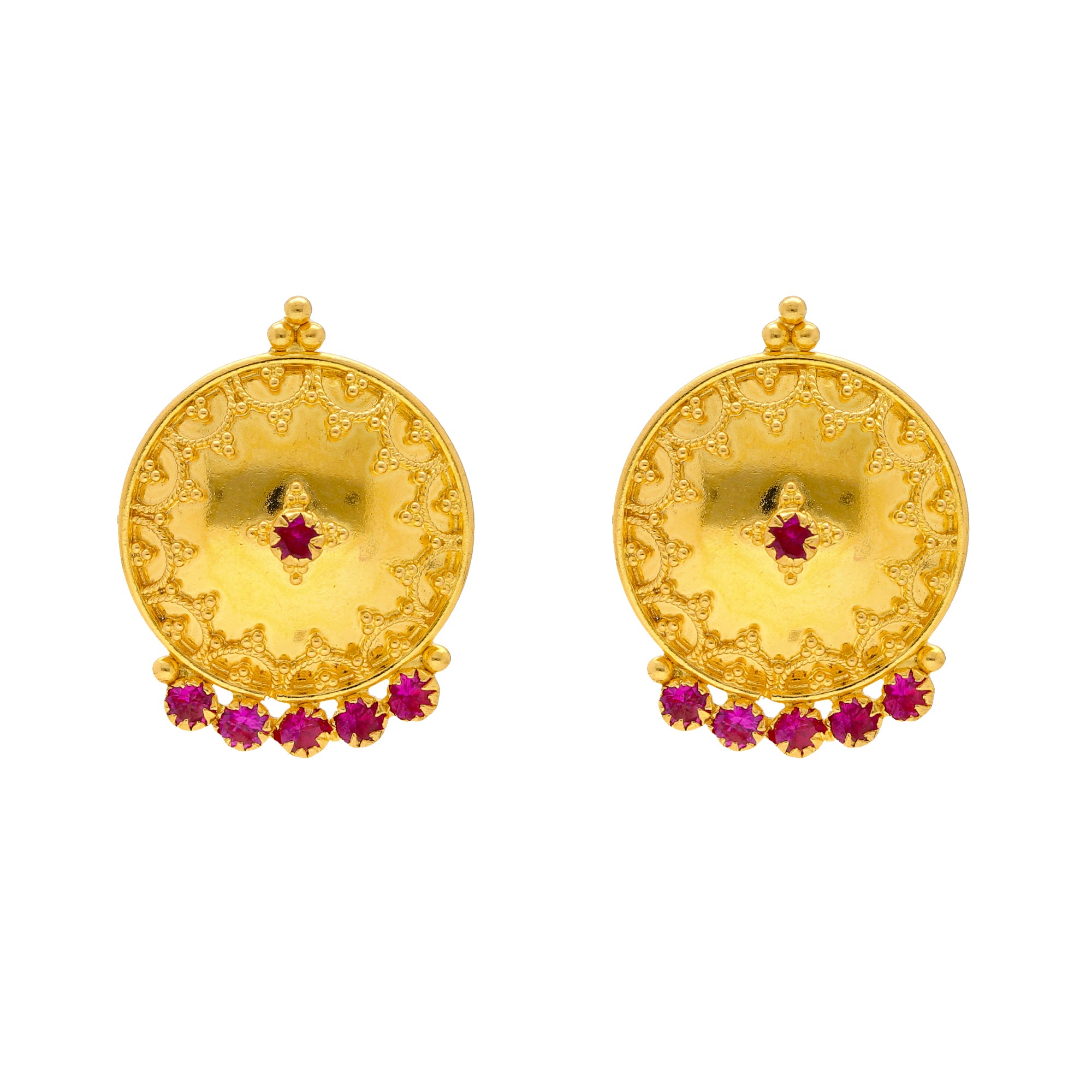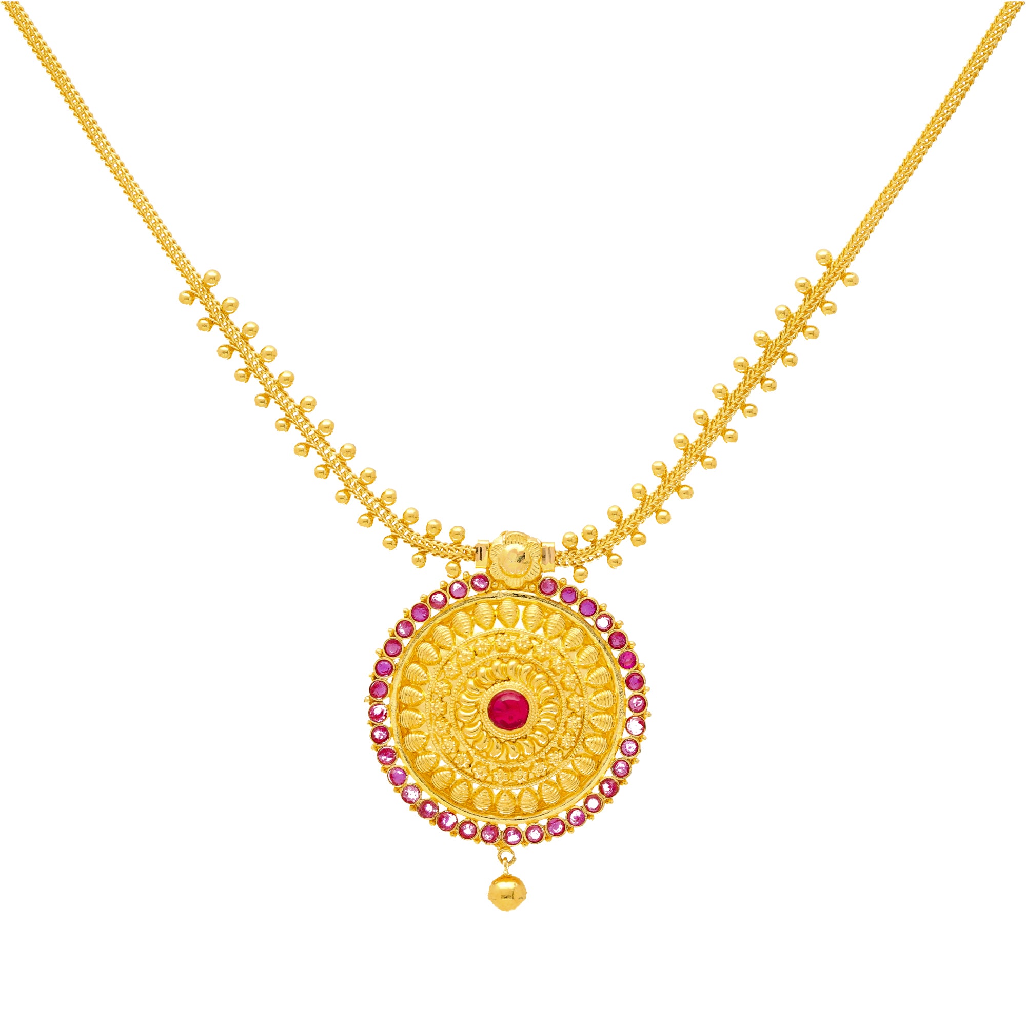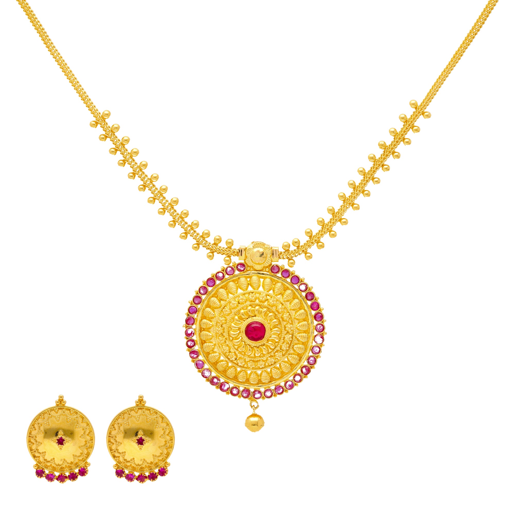 This ultra chic 22k yellow gold and ruby jewelry set for women has a unique design that makes it the perfect gold necklace and earring set to wear for special occasions.