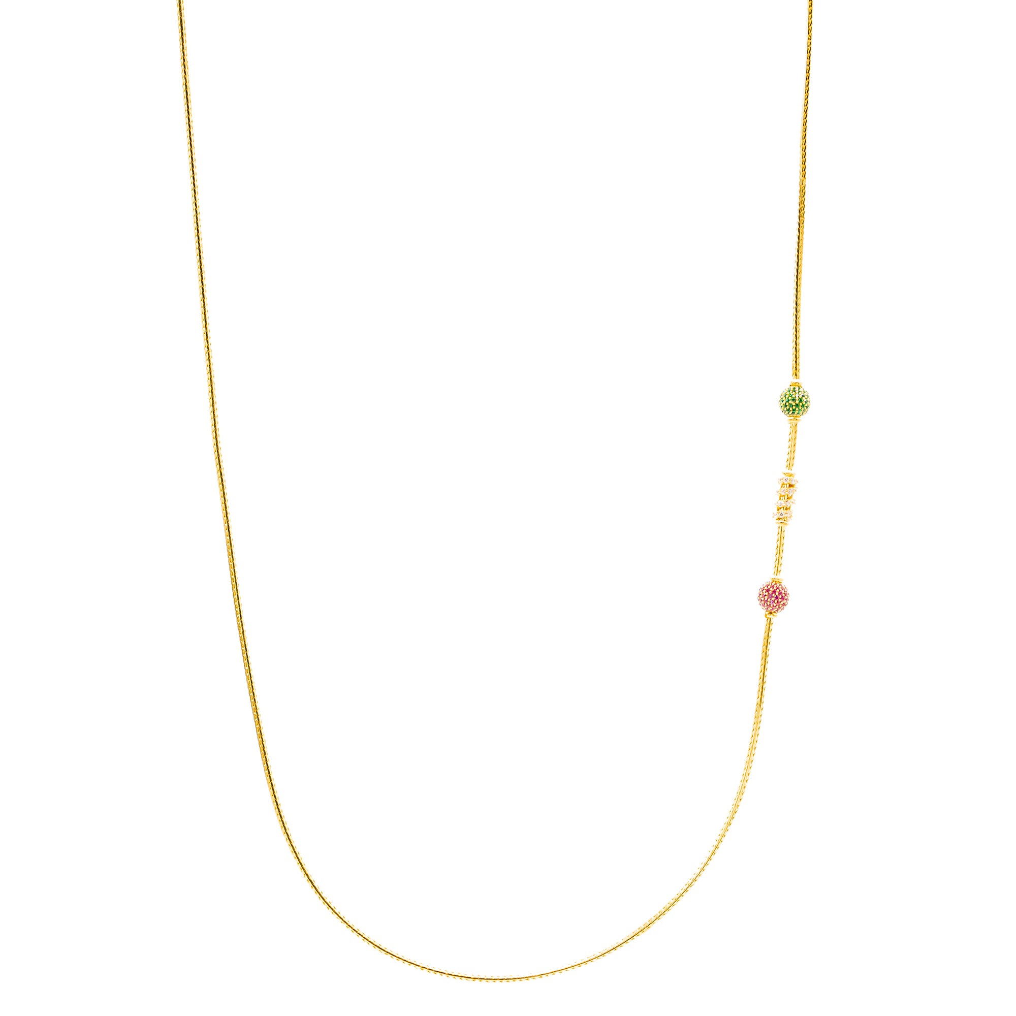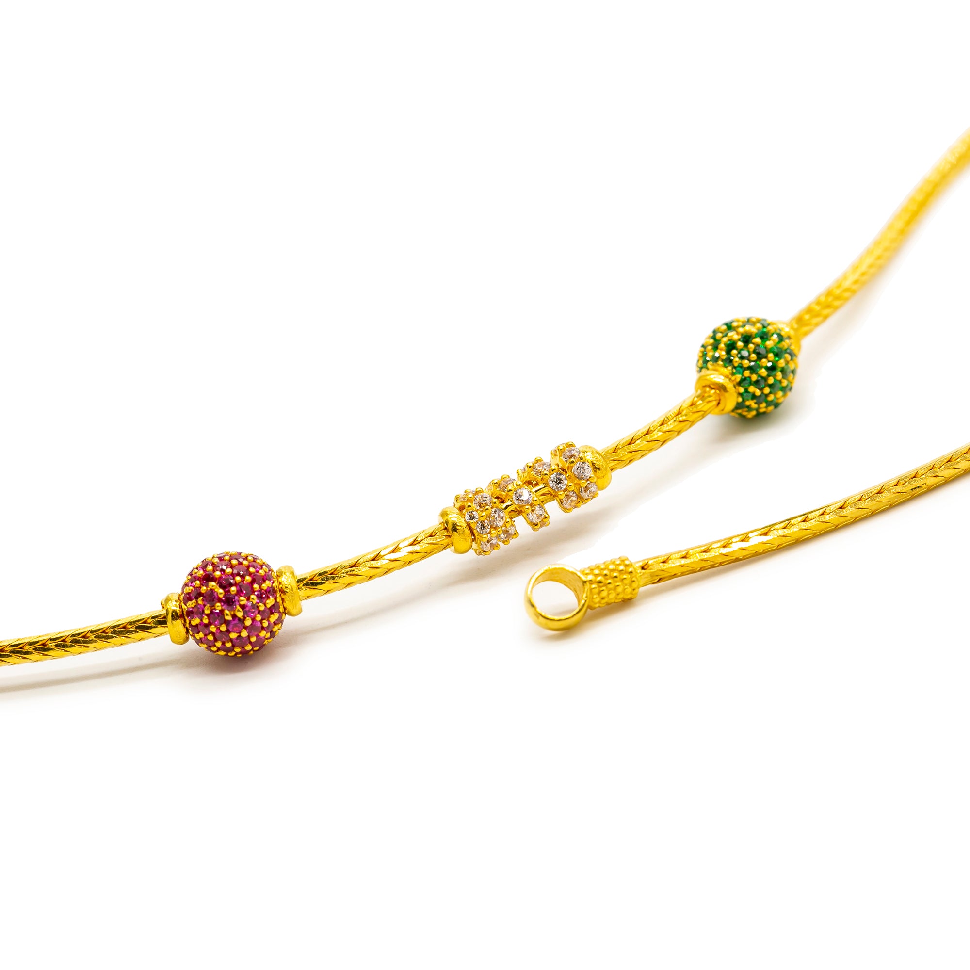 This sleek 22k gold mugappu chain for women has a classy and chic look. The emerald, ruby, and cubic zirconia details add a vibrant pop of color that can transform any casual assemble. Pair this wonderful Indian gold chain with one of our 22k gold pendants for a more lavish look.