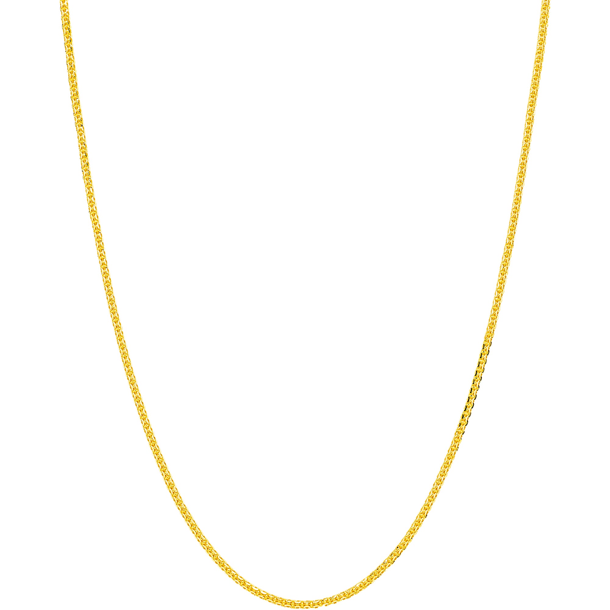 | Gracefully simple and beautifully crafted, this 22K yellow gold chain by Virani Jewelers is a timeless expression of Indian gold jewelry. The radiant warmth of 22K gold enhances its classic design, creating a refined look perfect for everyday wear or elegant layering. As a staple of fine gold jewelry, this chain offers versatility, sophistication, and the enduring beauty that only pure gold can provide. Features • 22K yellow gold Specifications • Minimum Width - 1 millimeter • Maximum Width - 2.5 millimeters • Length - 22 inches • Weight - 13.3 grams |