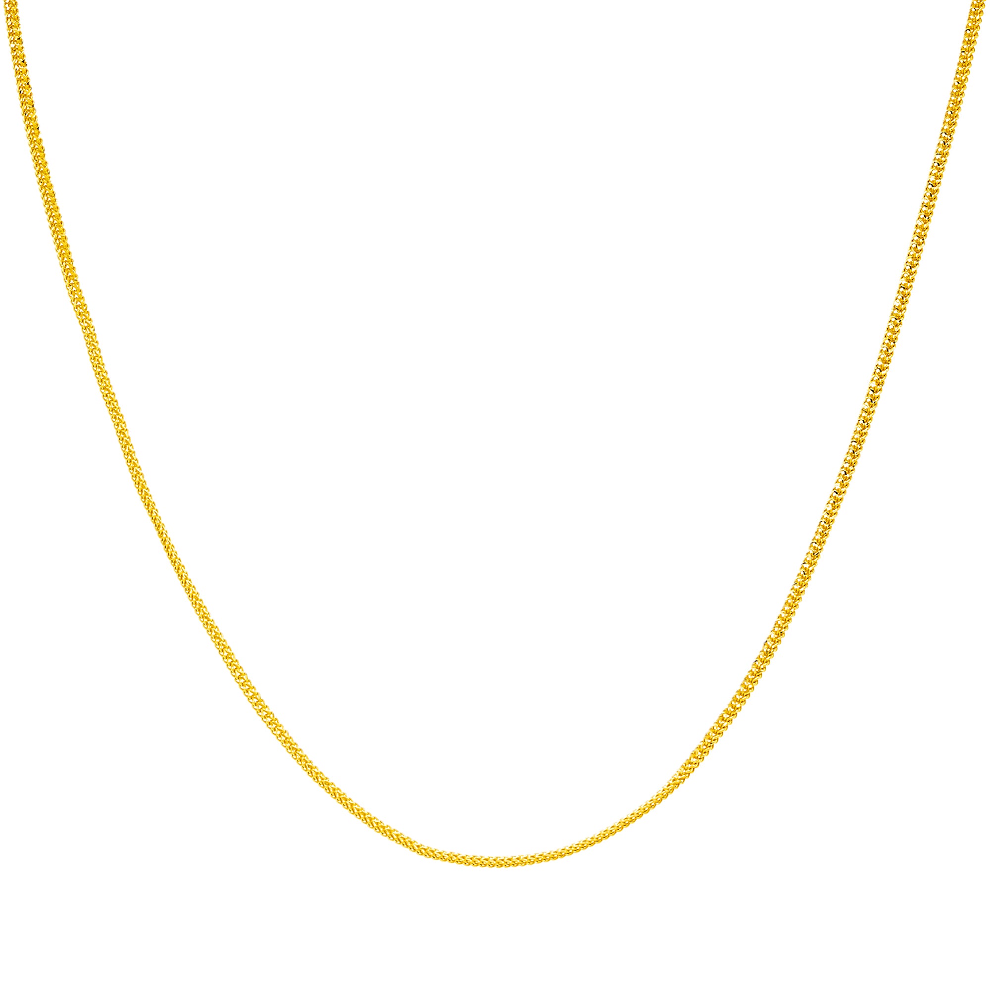 | Designed for timeless elegance, this 22K yellow gold chain by Virani Jewelers showcases the rich glow of traditional Indian gold jewelry. Crafted in luminous 22K gold, the classic chain design offers effortless versatility for both daily wear and special occasions. Whether styled alone or paired with a pendant, this fine gold jewelry piece brings understated luxury and enduring beauty to any collection. Features • 22K yellow gold Specifications • Minimum Width - 1 millimeter • Maximum Width - 2 millimeters • Length - 18 inches • Weight - 6.4 grams |