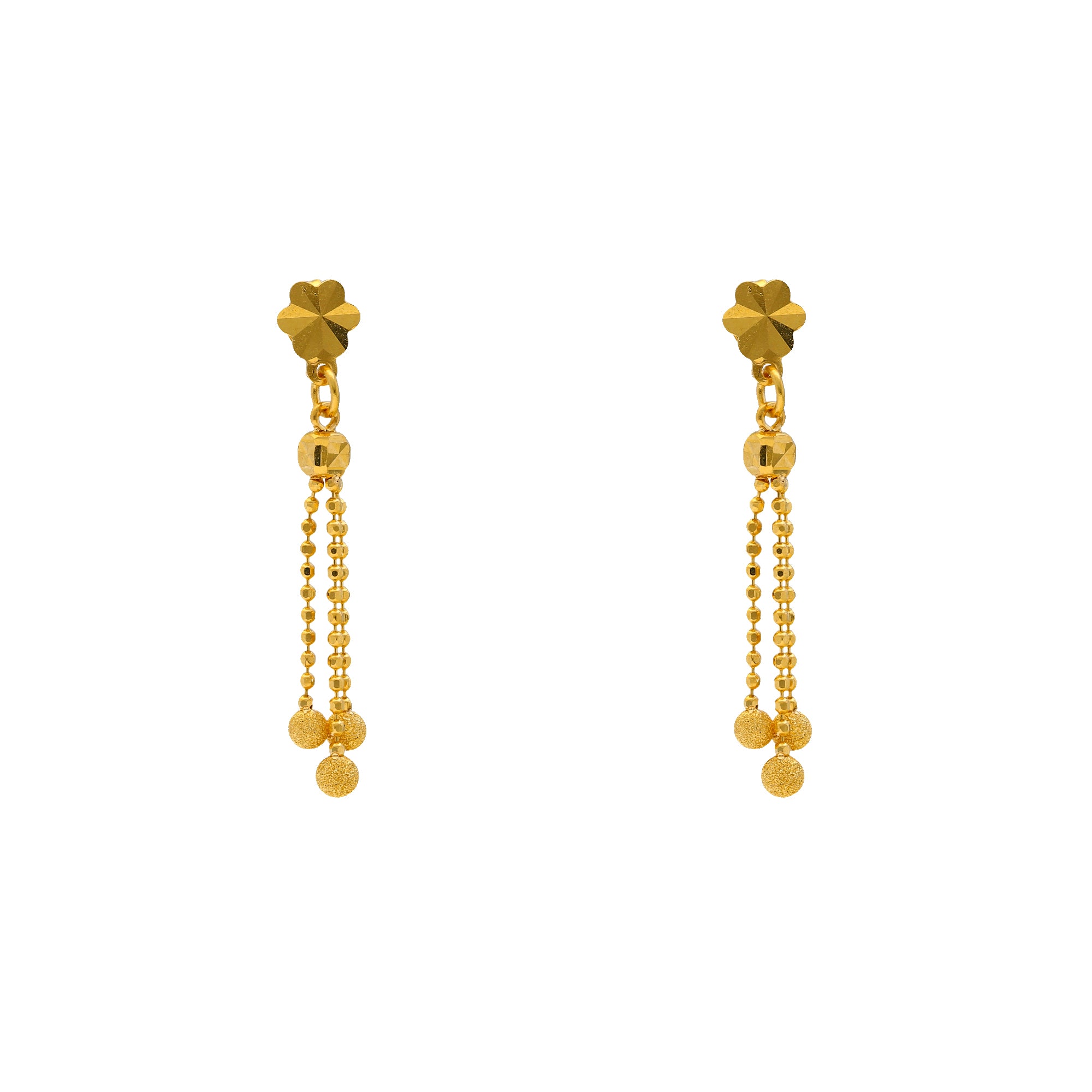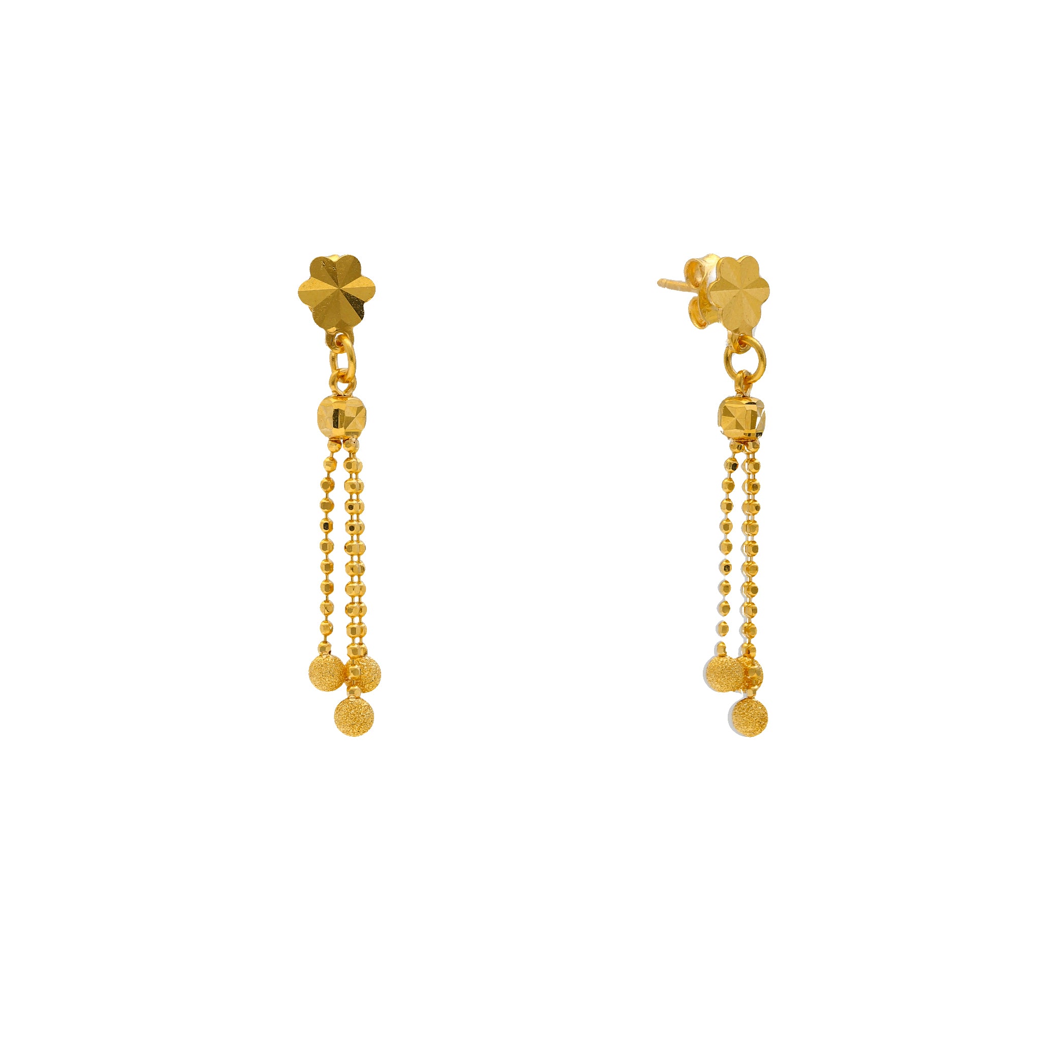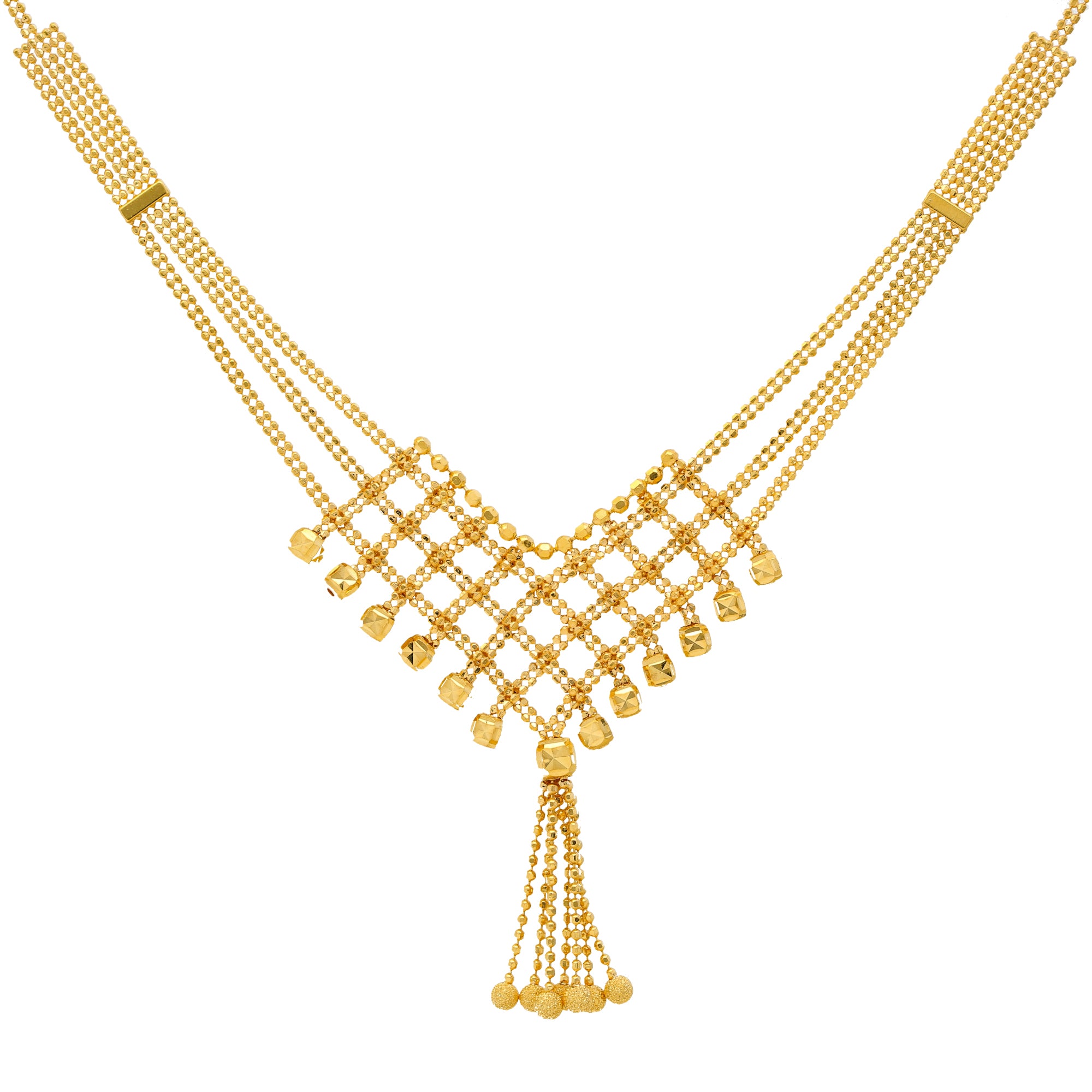 This stunning 22k yellow gold beaded necklace and earring set will highlight your best features. The gorgeous v-shaped necklace has a creative design and style that is enhanced by the matching dangle/drop earrings. Wear this creative beaded jewelry set for your most special occasion for a bold look of sophistication.