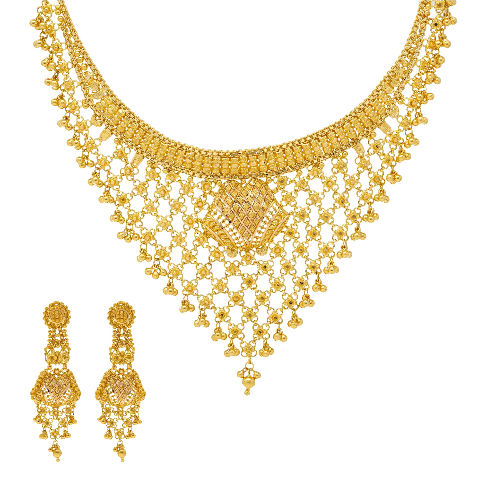 Our 22K Yellow Gold V Shaped Jewelry Set is just what a women needs to bring cultural elegance to their traditional Indian attire or formal wear. The elegant beaded details and feminine design of this 22k gold necklace and earring set will complement any look.