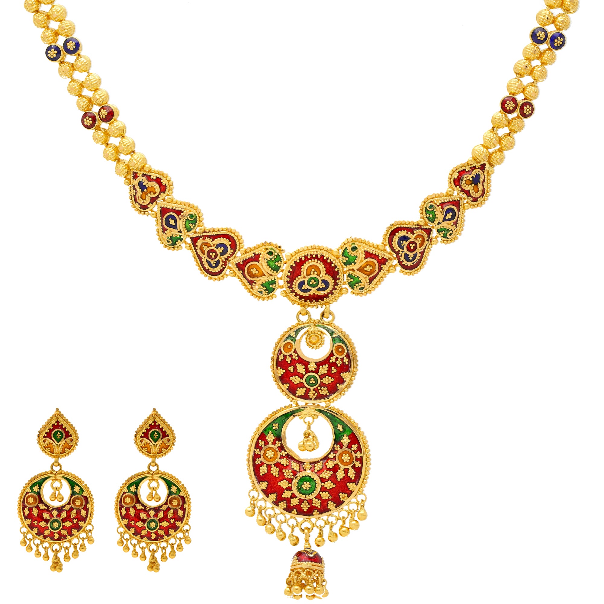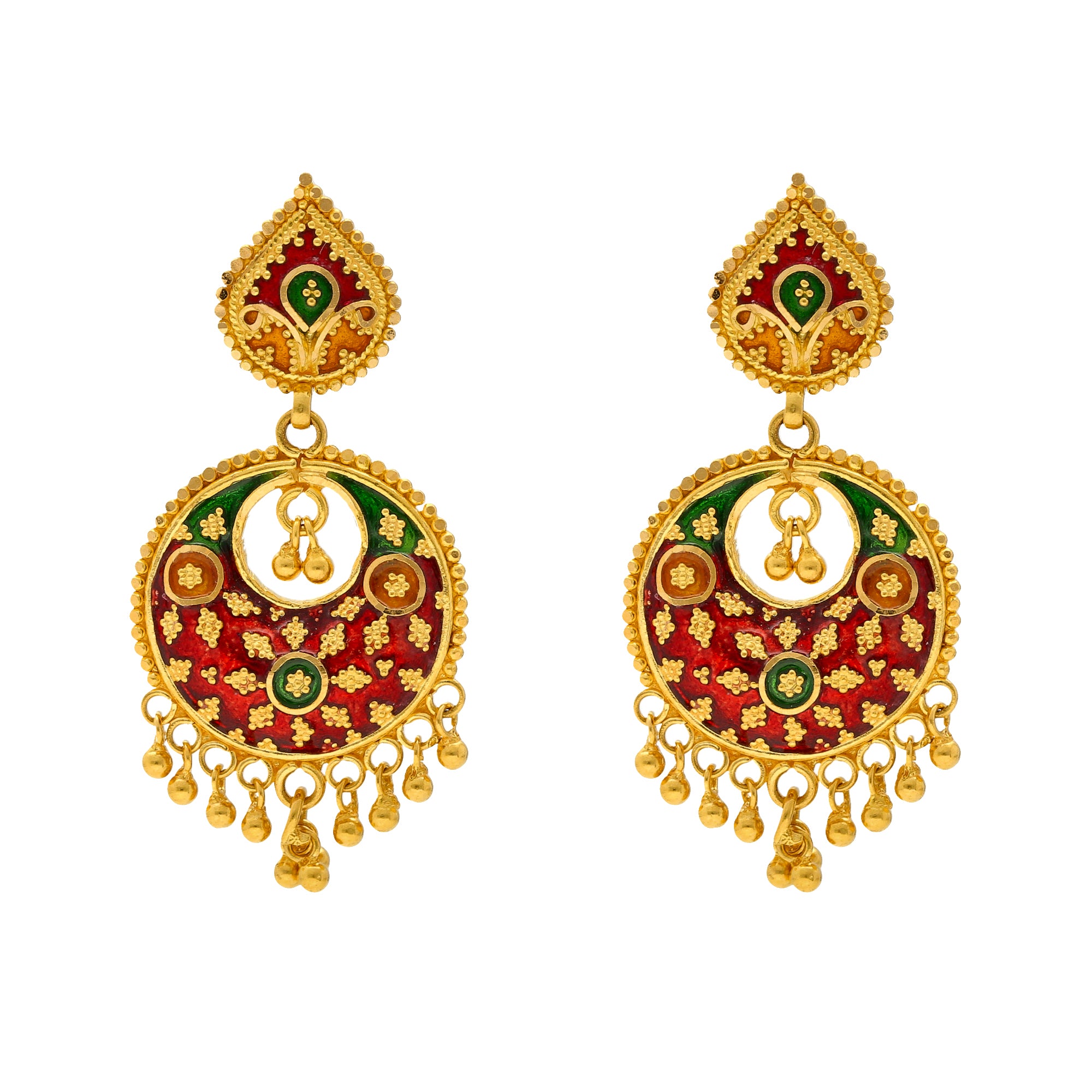 This 22k yellow gold and meenakari chandbali jewelry set will add a rich cultural elegance to your evening or bridal gowns.
